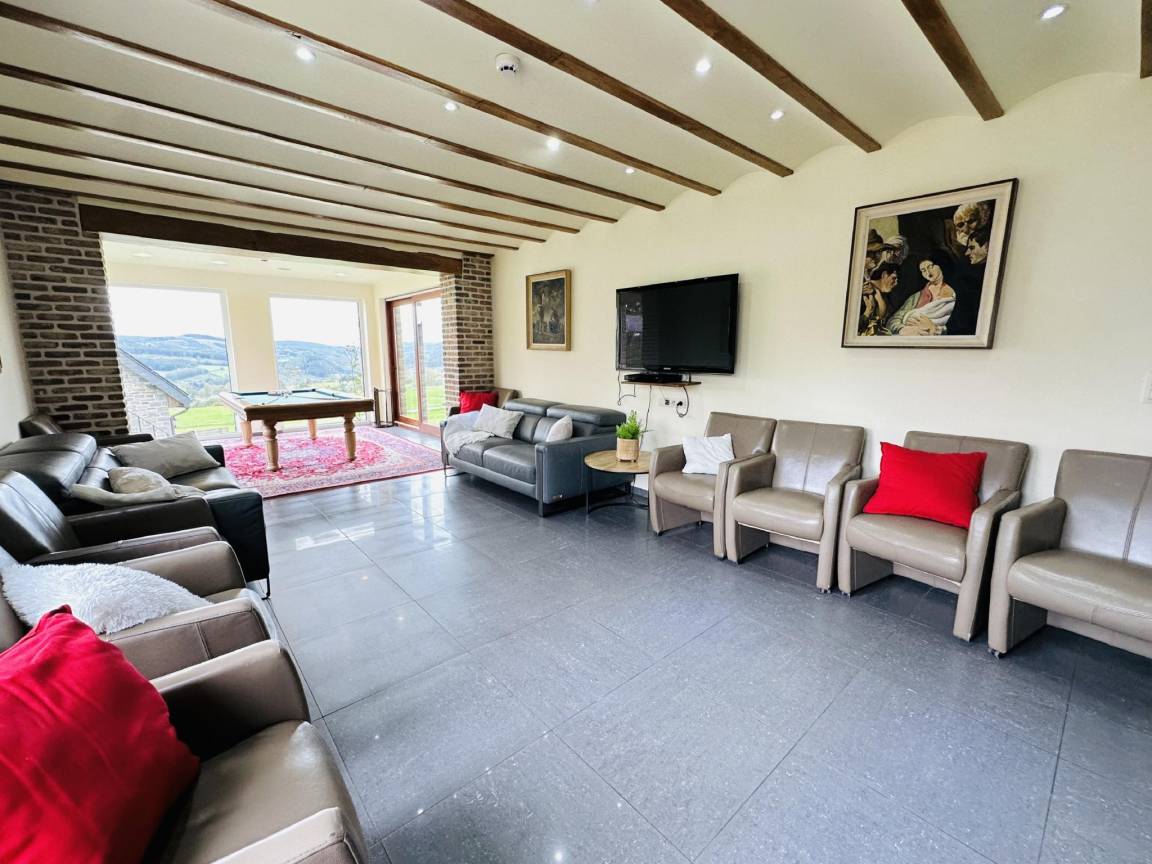 Hausbeschreibung : Entspannen Sie sich in diesem wunderschönen großen Haus mit einer tollen Aussicht auf die umliegende Landschaft. Es verfügt über einen beheizten Pool, halb innen und halb außen, mit Blick auf den Garten, und einen Entspannungsbereich mit Sauna und Sonnenbank. Außerdem gibt es einen Billardtisch mit Aussicht, einen Grill und einen großen Garten mit Schaukel und Tischtennisplatte.