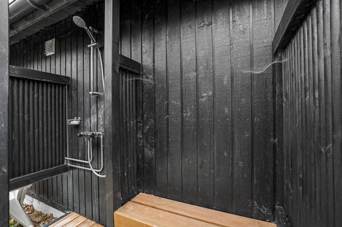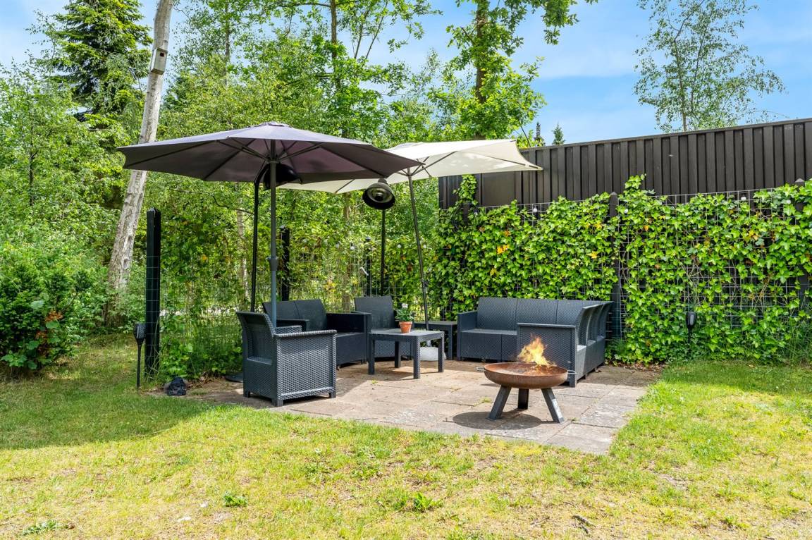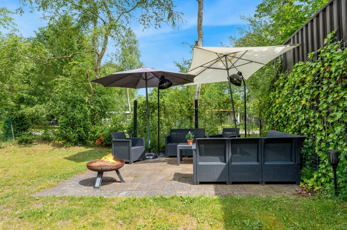 Das Haus hat ein großes Grundstück mit Fußballtoren und Platz für Ballspiele usw. Es gibt eine schöne Terrasse, die auch einen überdachten Bereich hat. Im Garten gibt es einen Grill und eine Feuerstelle. Außerdem gibt es eine Außendusche für die Frischen.