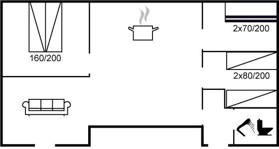 SchlafverhältnisseDie Schlafplätze verteilen sich auf 3 Schlafräume. 2 Schlafplätze in einem Doppelbett. 2 Schlafplätze in Einzelbetten. 2 Schlafplätze in einem Etagenbett.