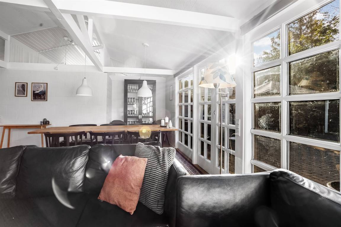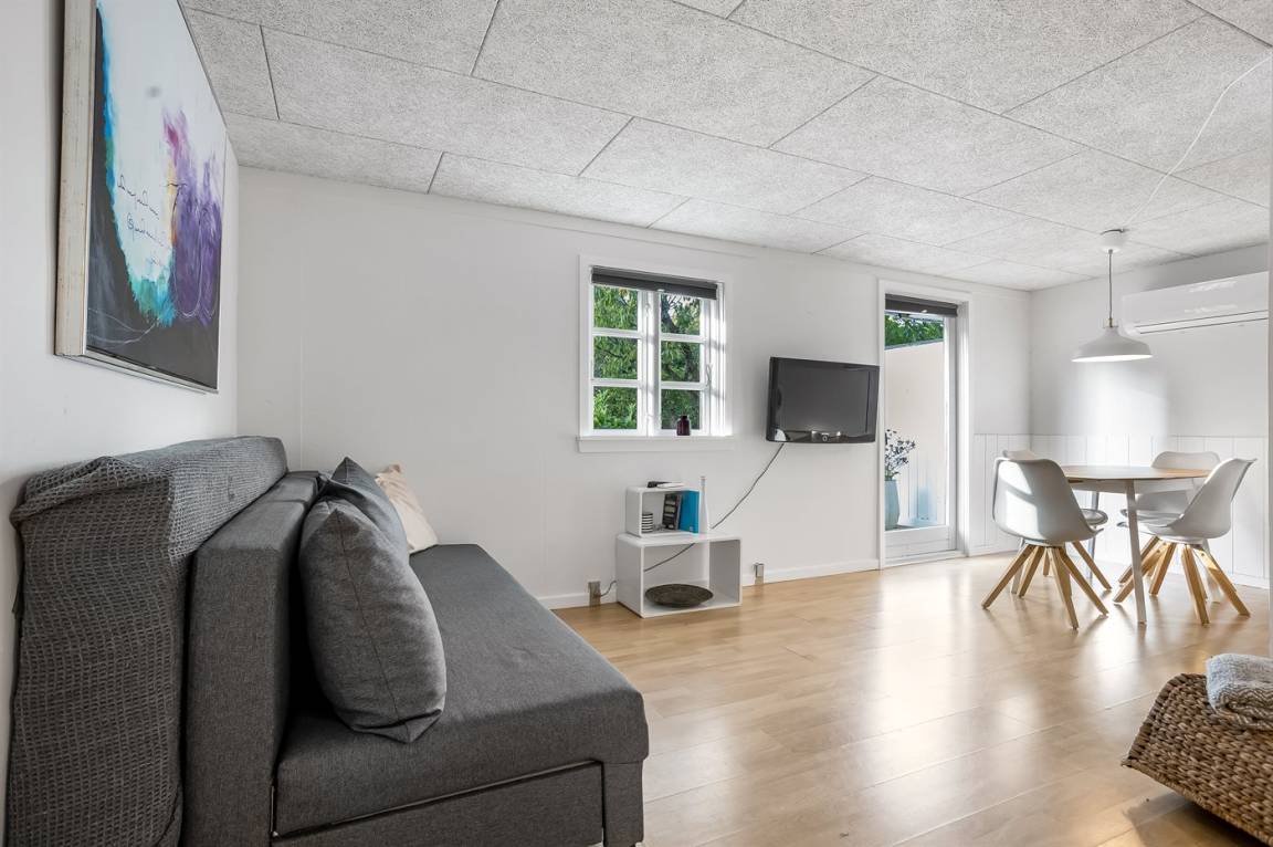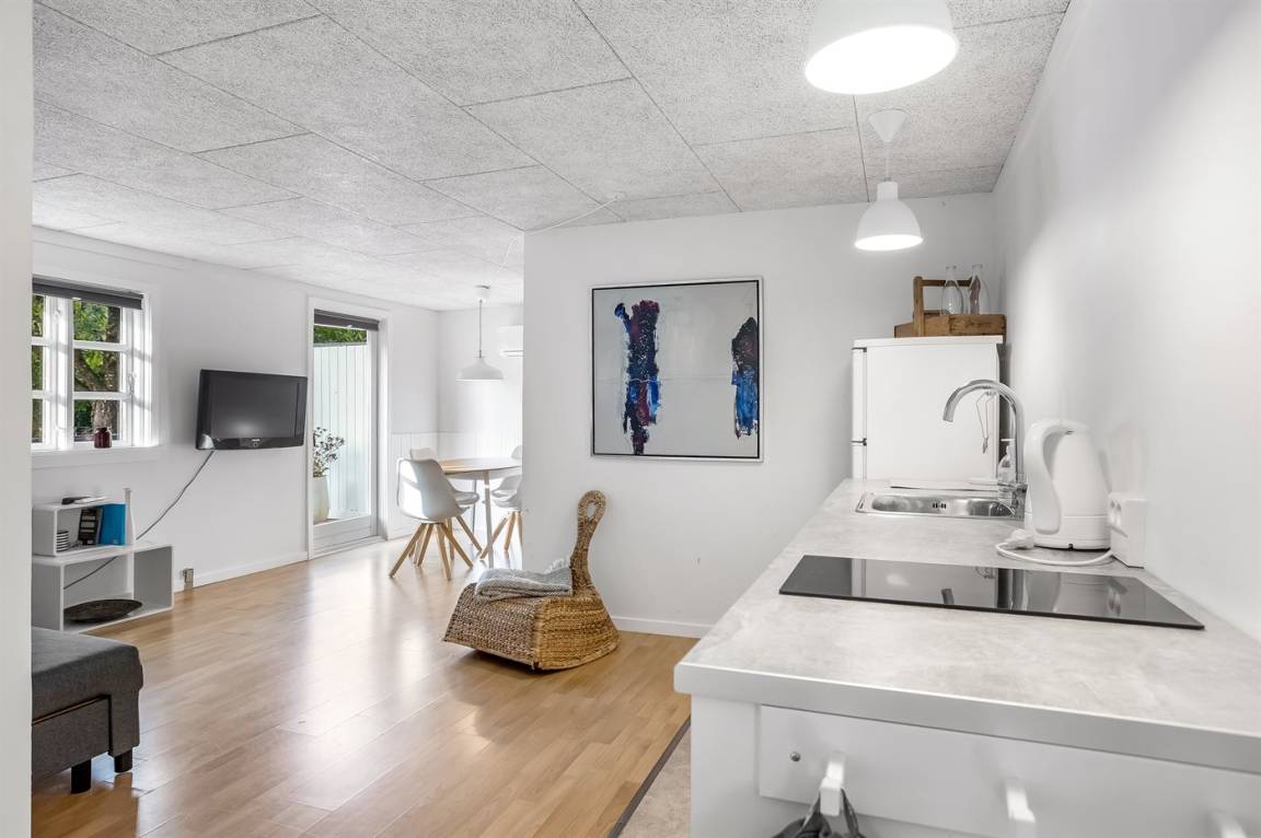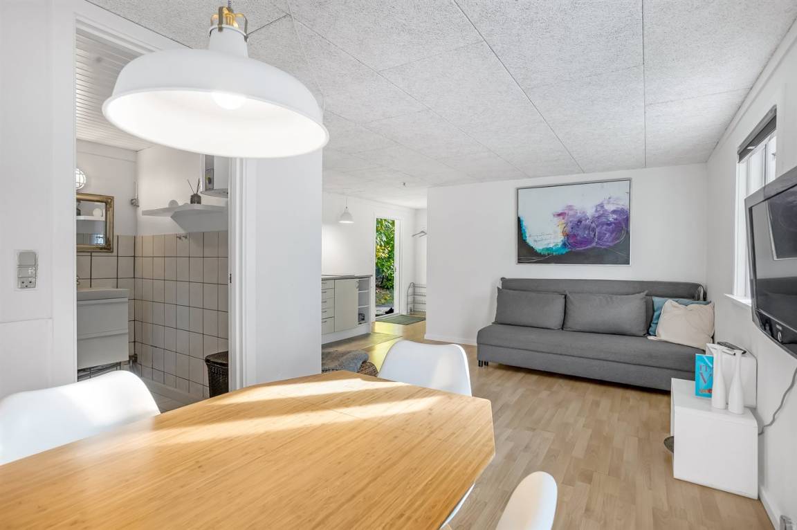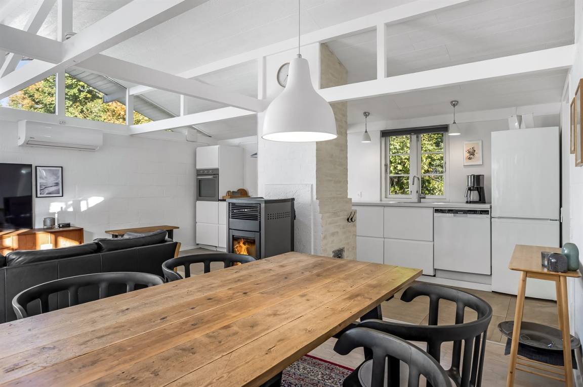Das Haus hat eine Wohnfläche von 124 m² sowie ein dazugehöriges Gästehaus und einen Aktivitätsraum. Das Sommerhaus ist mit einer schönen Küche in offener Verbindung mit dem Essbereich und dem Wohnzimmer eingerichtet. Von hier hast du direkten Zugang zum Innenhof und zur Sonnenterrasse. Außerdem gibt es einen Eingangsbereich, ein Badezimmer und zwei Schlafzimmer – beide mit Doppelbetten.