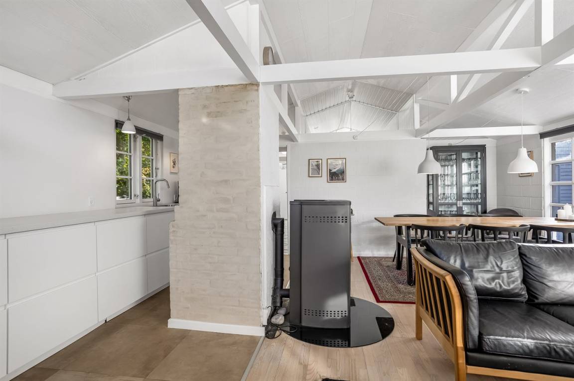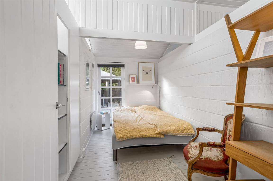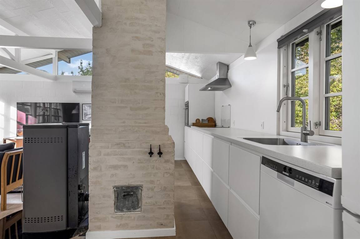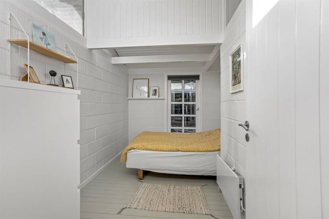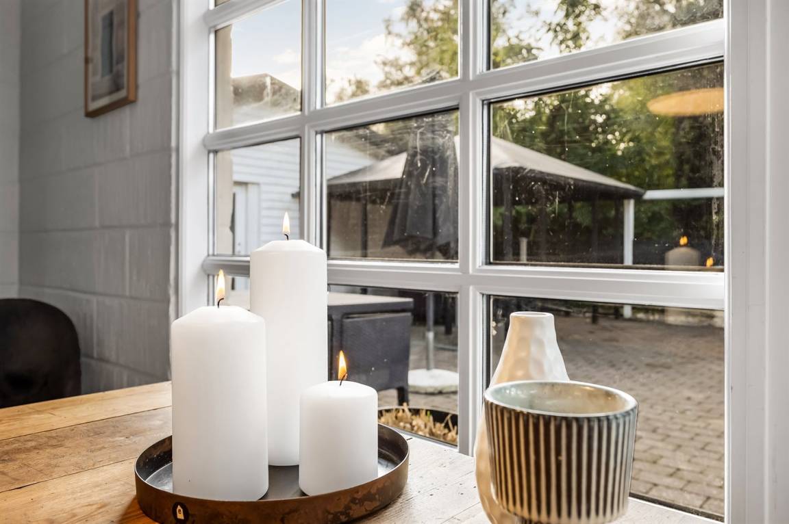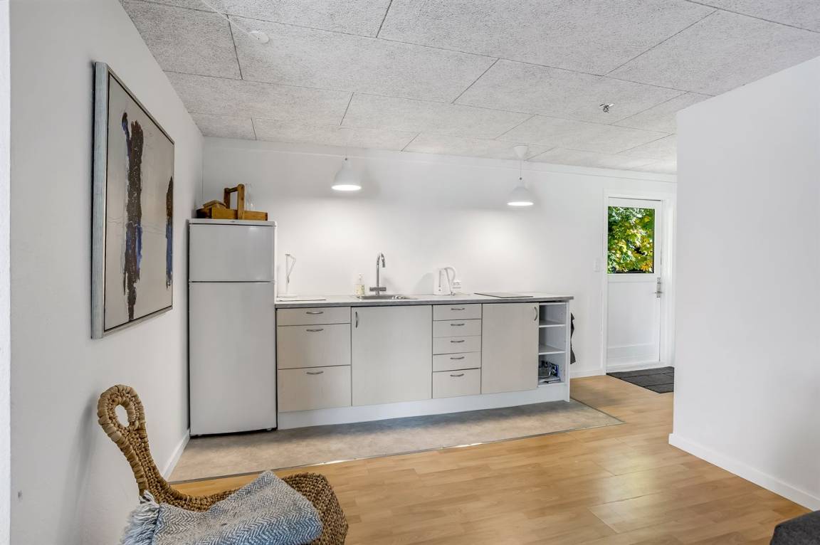 Das Haus hat eine Wohnfläche von 124 m² sowie ein dazugehöriges Gästehaus und einen Aktivitätsraum. Das Sommerhaus ist mit einer schönen Küche in offener Verbindung mit dem Essbereich und dem Wohnzimmer eingerichtet. Von hier hast du direkten Zugang zum Innenhof und zur Sonnenterrasse. Außerdem gibt es einen Eingangsbereich, ein Badezimmer und zwei Schlafzimmer – beide mit Doppelbetten.