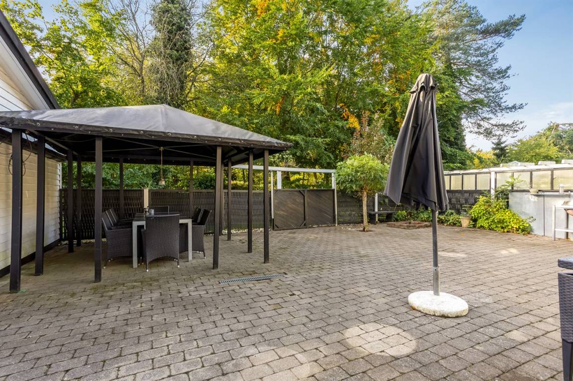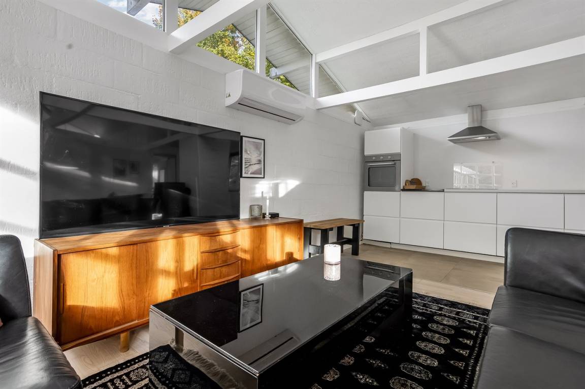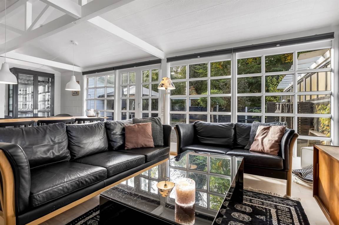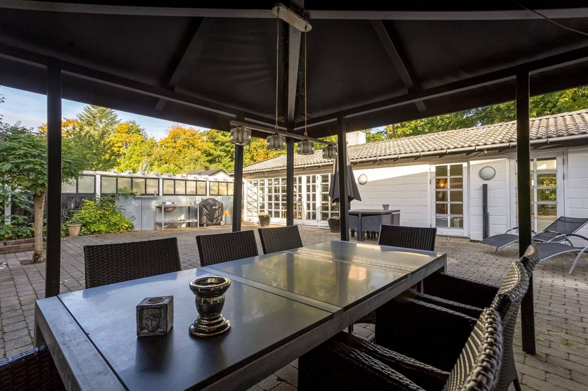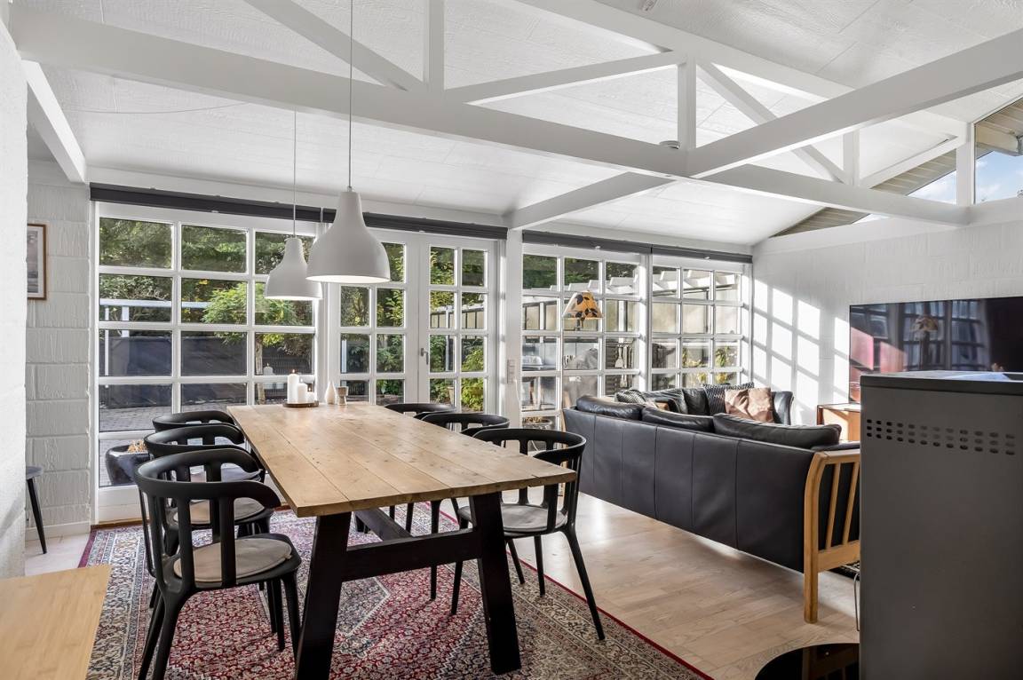 Das Haus hat eine Wohnfläche von 124 m² sowie ein dazugehöriges Gästehaus und einen Aktivitätsraum. Das Sommerhaus ist mit einer schönen Küche in offener Verbindung mit dem Essbereich und dem Wohnzimmer eingerichtet. Von hier hast du direkten Zugang zum Innenhof und zur Sonnenterrasse. Außerdem gibt es einen Eingangsbereich, ein Badezimmer und zwei Schlafzimmer – beide mit Doppelbetten.