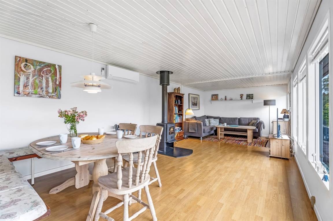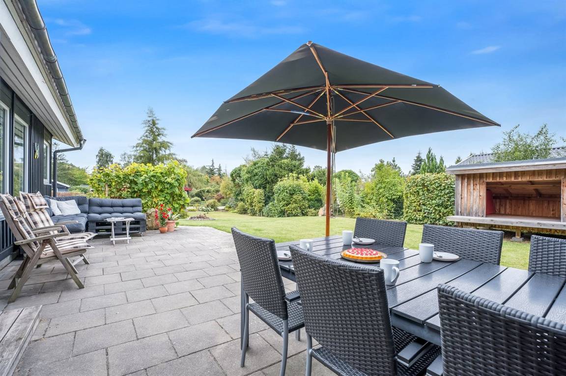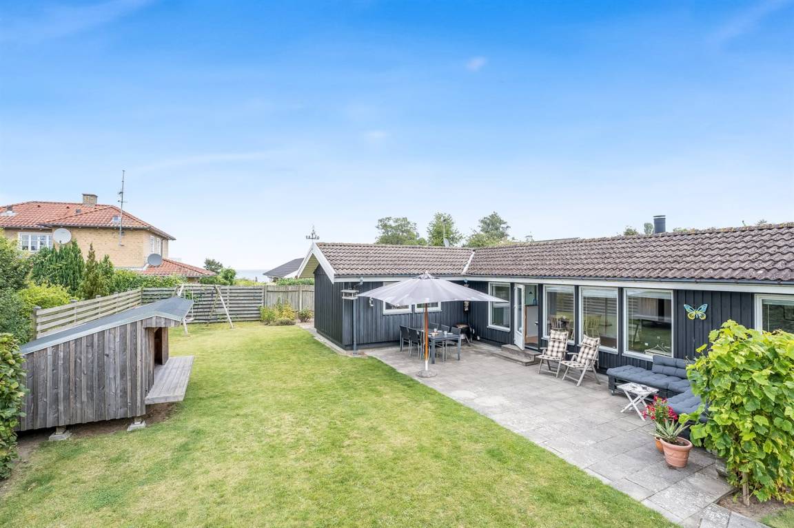 Ferienhaus ca. 100 m vom Strand mit Badesteg, Spielplatz mit Schaukeln, Wippe und Rutsche sowie einem kleinen Privatstrand mit Zugang für die Mieter des Hauses gelegen. Am Haus gibt es zwei schöne Terrassen.