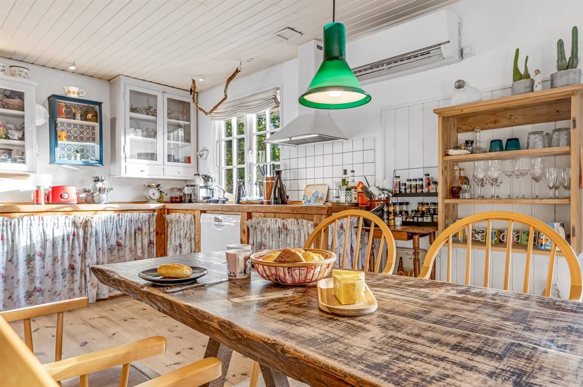 Das Ferienhaus ist gemütlich eingerichtet mit einer offenen Küche, die mit dem Wohnzimmer kombiniert ist, wo es ein gemütliches Hochbett gibt. Es gibt ein Schlafzimmer im Haupthaus mit einem kleinen Doppelbett (120x200), dazu ein offenes Obergeschoss mit zwei Matratzen. Von der Terrasse aus habt ihr Zugang zu dem großen Gästehaus mit zwei weiteren Schlafzimmern und einem Badezimmer. Perfekt für Gäste oder wenn sich die Familie etwas aufteilen möchte.