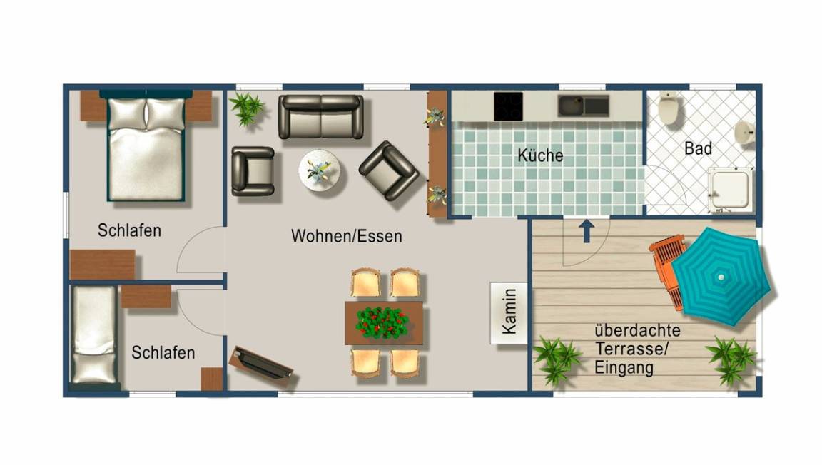 Auf rund 55qm finden bis zu drei Personen Platz. Das großzügige Wohn-/Esszimmer bietet freie Sicht auf das 2.000qm große Grundstück. Am Kamin kann man abends manch gemütliche Stunde genießen (Kaminholz inklusive). Angrenzend befinden sich die beiden Schlafzimmer. In der voll ausgestatteten Einbauküche mit Spülmaschine, Kühlschrank, Mikrowelle Herd mit Backofen, Senseo und Kaffeemaschine und vielem mehr macht das Kochen auch im Urlaub Freude. Das Bad ist klein und fein mit Dusche und WC ausgestattet.
