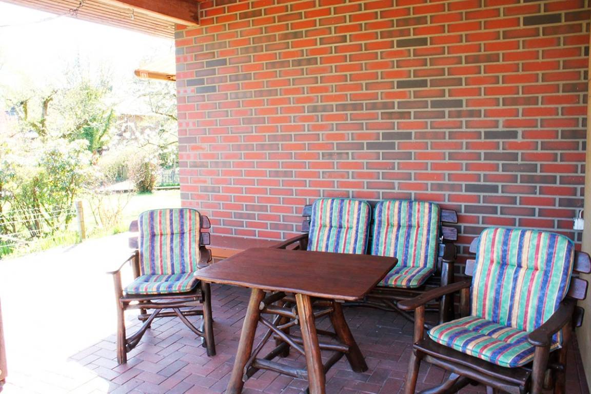 Die überdachte und möblierte Sitzecke lädt zum Verweilen im Freien oder zu einem gemütlichen Grillabend ein. Im Garten gibt es reichlich schöne Plätze im Grünen und tolle Spielmöglichkeiten für Kinder.