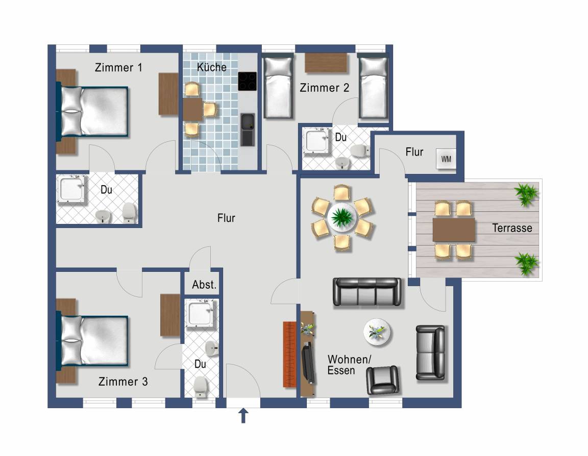 Alle Zimmer befinden sich im Erdgeschoss. Neben einem großen Wohnbereich mit Essplatz gibt es 3 Schlafzimmer - jeweils mit eigenem Duschbad/ WC - eine Diele und eine Küche ausgestattet mit Kühlschrank, Gefrierschrank, Geschirrspüler, Kaffeemaschine, Wasserkocher, Toaster und Mikrowelle.