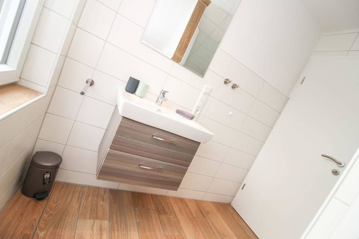 Das gesamte Erdgeschoss ist mit Fliesen in Holzoptik ausgestattet. Im Obergeschoss wurde barfußfreundliches Vinyl in Holzoptik in den Schlafräumen verarbeitet. Das Badezimmer im Obergeschoss ist wiederum mit Fliesen ausgelegt. Geheizt wird im gesamten Haus mit einer Fußbodenheizung, die natürlich für jeden Raum separat eingestellt werden kann. Nahezu ausnahmslos sind LED-Deckenspots verbaut.