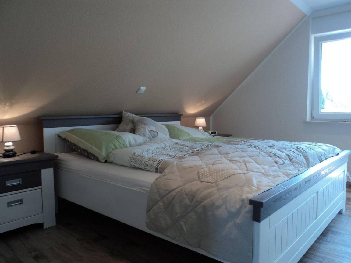 Die schöne Treppe im Landhausstil führt Sie ins Obergeschoss. Hier befindet sich das Elternschlafzimmer mit komfortablen Doppelbett. Vom Schlafzimmer gelangen Sie auf den Balkon mit Blick aufs Wasser.