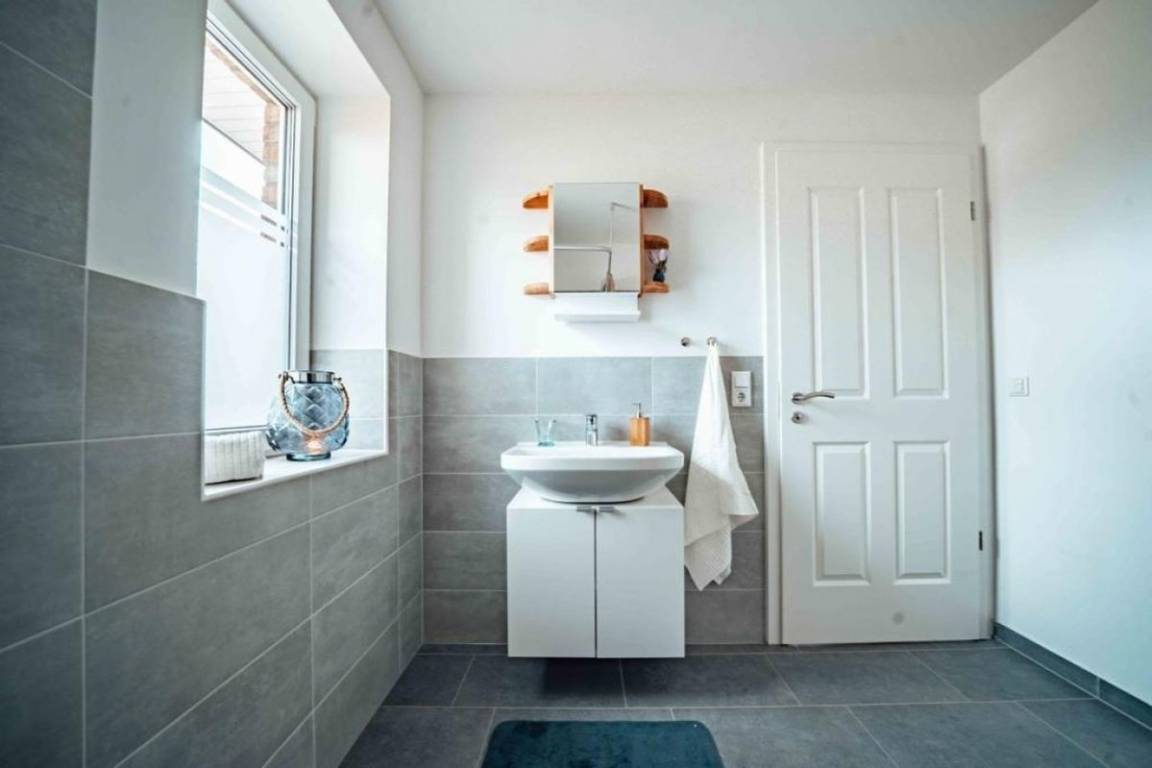 Das moderne Duschbad mit ebenerdiger Dusche, Spiegel und Fön wird ebenfalls durch Tageslicht erhellt.