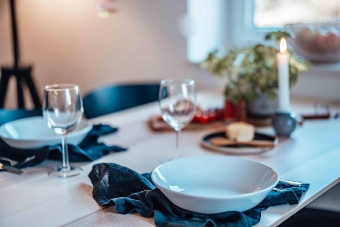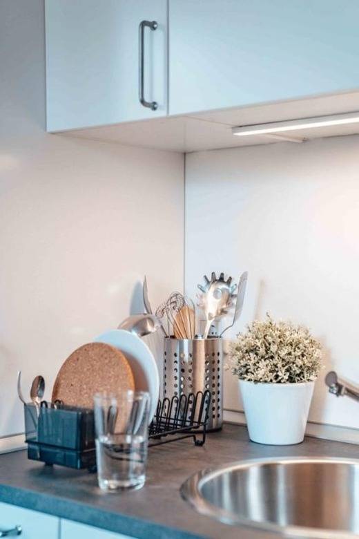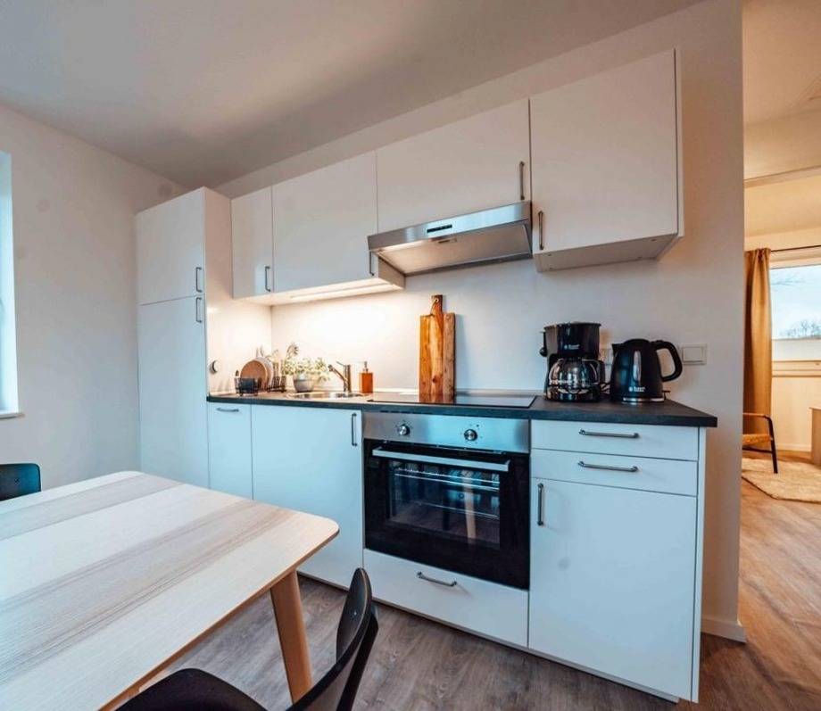 Der zentrale Ort der Wohnung ist ein helles Wohn-/Esszimmer mit einer Küchenzeile, Stühlen und einem Esstisch. Die hochwertige Küche ist mit Markengeräten (Filter-Kaffeemaschine usw.) ausgestattet.