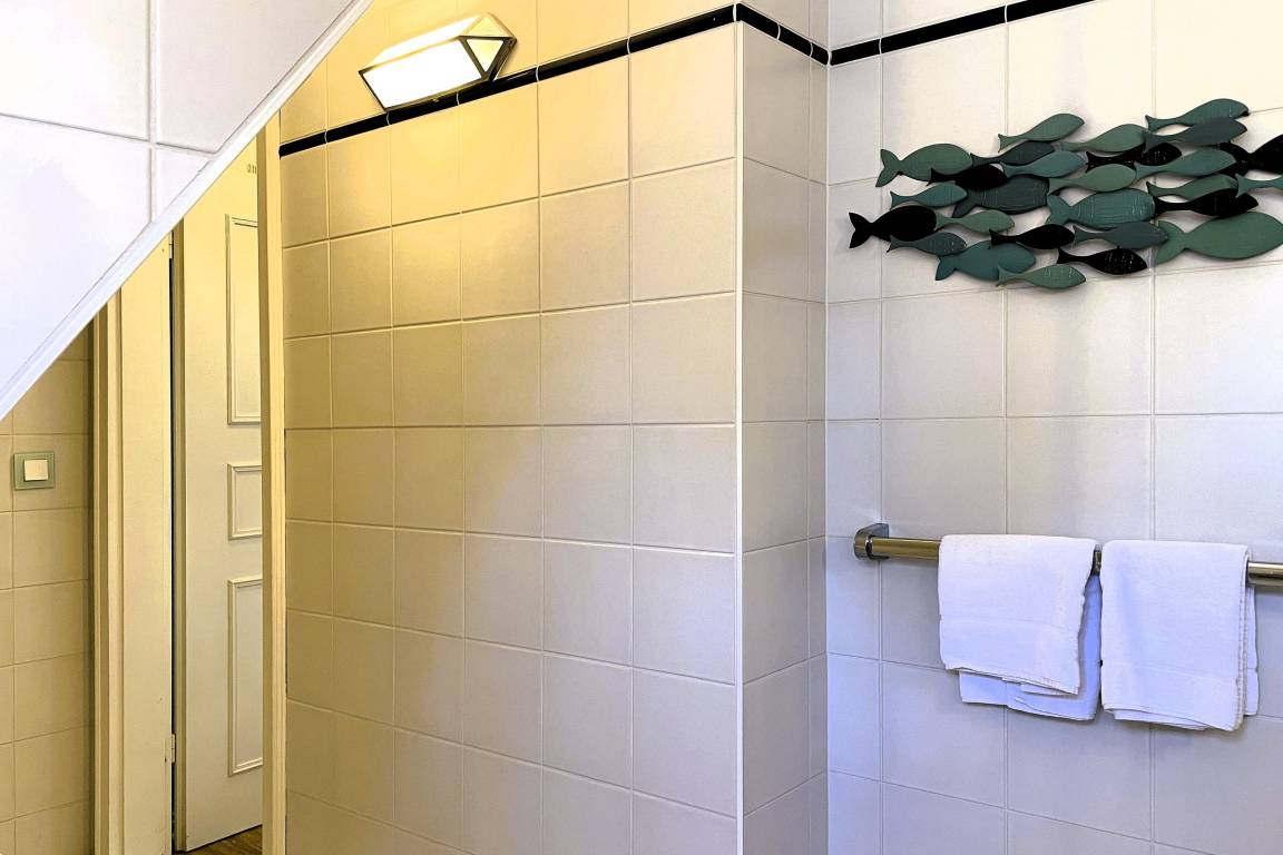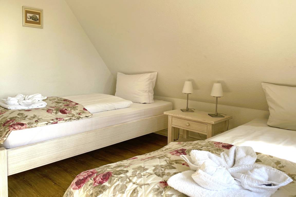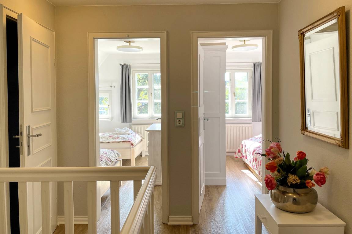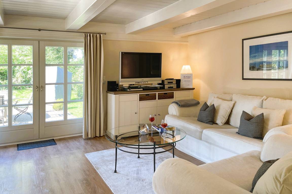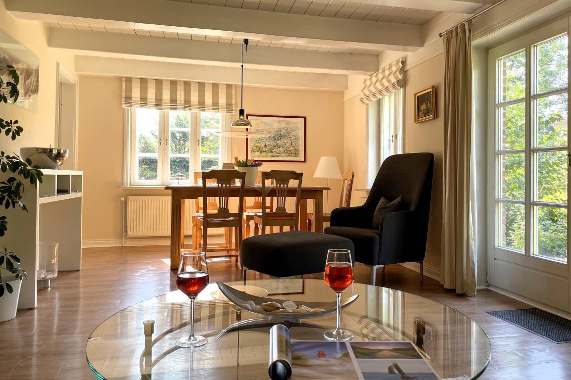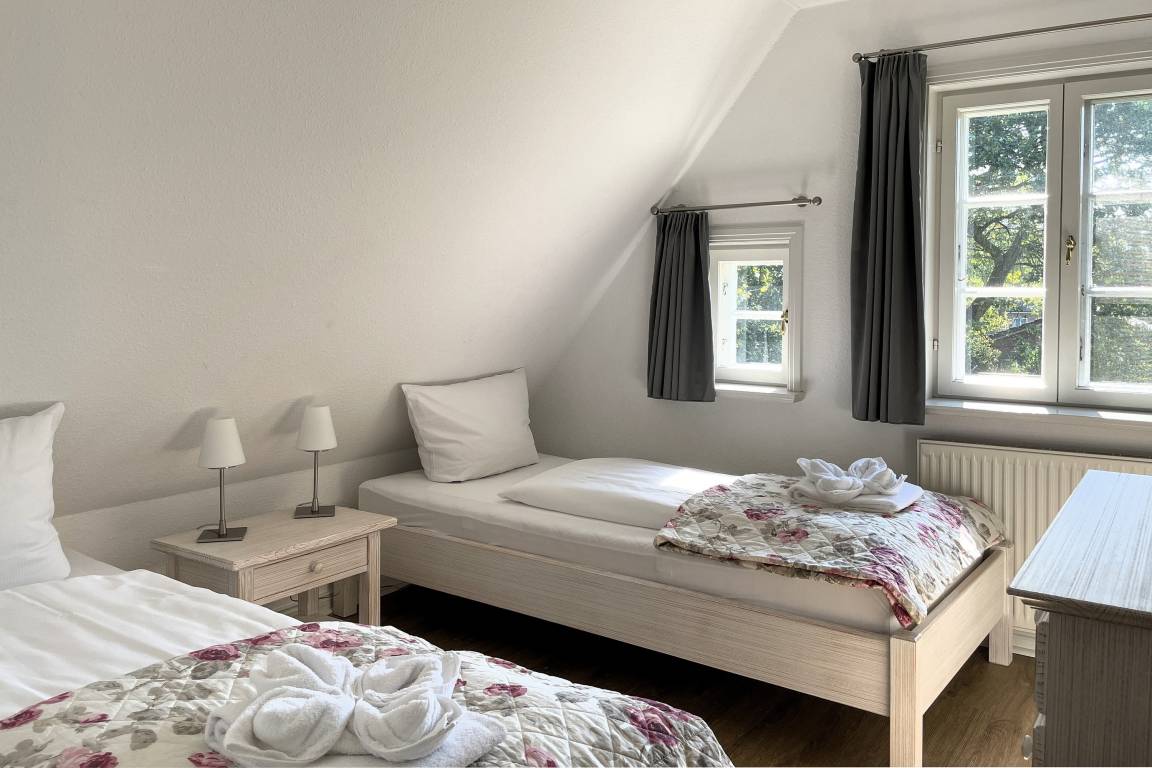 Süderende- erleben Sie friesische Gastfreundschaft in einem echten Friesendorf und unserer Haushälfte "Süderhüs". Unsere linke Haushälfte Süderhüs in Süderende erstreckt sich mit 95 m über 2 Etagen und bietet 5 Personen Platz für herrliche Urlaubstage. Betreten Sie Ihr Urlaubsdomizil und fühlen Sie sich sogleich Willkommen in der ruhig gelegenen Haushälfte, die viel Gemütlichkeit und Behaglichkeit ausstrahlt. Liebevoll eingerichtet und harmonisch aufeinander abgestimmt finden Sie im Erdgeschoss einen einladenden Wohn- und Essbereich mit großem Flachbild- TV, DVD-Player, Telefon, einer bequemen Sitzgruppe, WLAN und Stereoanlage. An das Wohnzimmer angrenzend befindet sich die gut ausgestattete, helle Küche mit Cerankochfeld und Backofen, Geschirrspüler, Mikrowelle, Kühlschrank mit Gefrierfach und vielem mehr. Ein kleiner Essplatz lädt hier um ersten Kaffee am Morgen ein. Des Weiteren liegt im Erdgeschoss ein kleines Vollbad mit Dusche und Fußbodenheizung. Vom Flur aus gelangen Sie über eine Treppe ins erste Obergeschoß mit seinen drei Schlafzimmern und einem zweiten Vollbad mit Dusche. Die Schlafräume unterteilen sich in ein Zimmer mit Doppelbett (180x200) und Kleiderschrank, ein weiteres Schlafzimmer mit zwei Einzelbetten (90x 200cm) und Kommode sowie ein Schlafzimmer mit Einzelbett (100 x200 cm)und einem 2. Flachbild-TV (Internet). Sie werden sich nicht nur im Haus, sondern auch im großzügig angelegten Garten, welcher mit seiner Süd-Westausrichtung den ganzen Tag Sonnenstunden ermöglichen kann, sehr wohl fühlen. Genießen Sie Kaffee und Kuchen auf der schönen Terrasse, entspannen Sie mit einem guten Buch in dem romantischen Strandkorb oder sonnen Sie sich auf den Liegen im blickgeschützten Garten.
