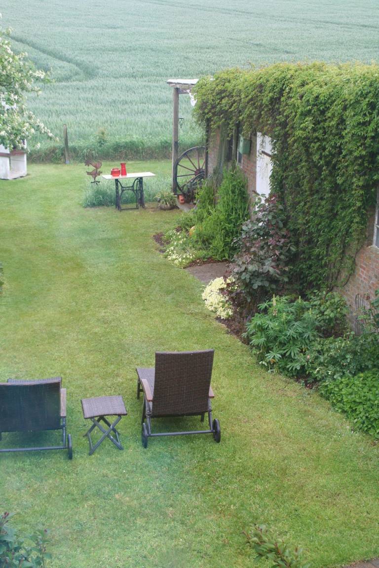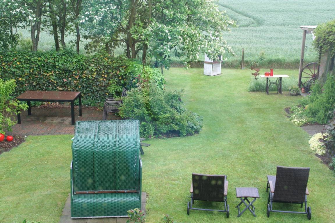 Im großen Garten finden Sie mehrere geschützte Sitzplätze mit Gartenmöbeln und Strandkörben.