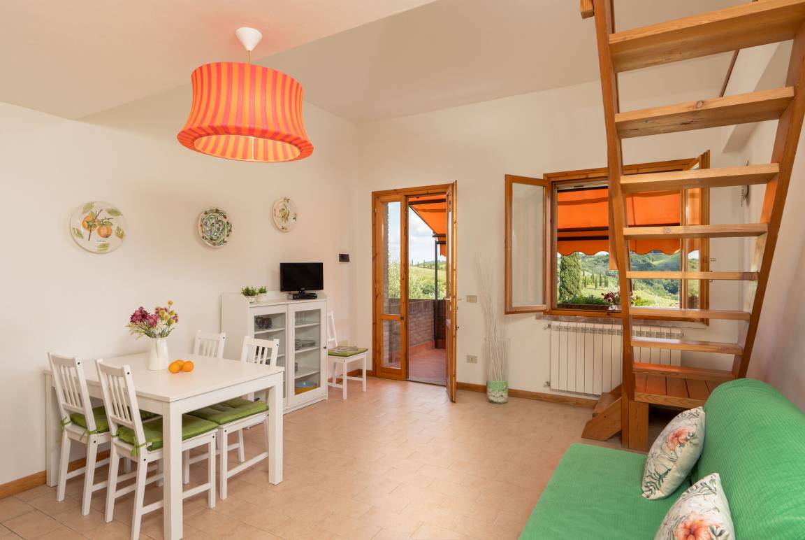 Im ersten Stock befindet sich ein Wohnbereich mit Esszimmer, eine Schlafcouch, ein SAT TV mit Flachbildschirm, eine Kochnische mit 4 Kochfelder, Spülmaschine, Mikrowellenherd, Kaffeemaschine, ein Schlafzimmer und ein Badezimmer.