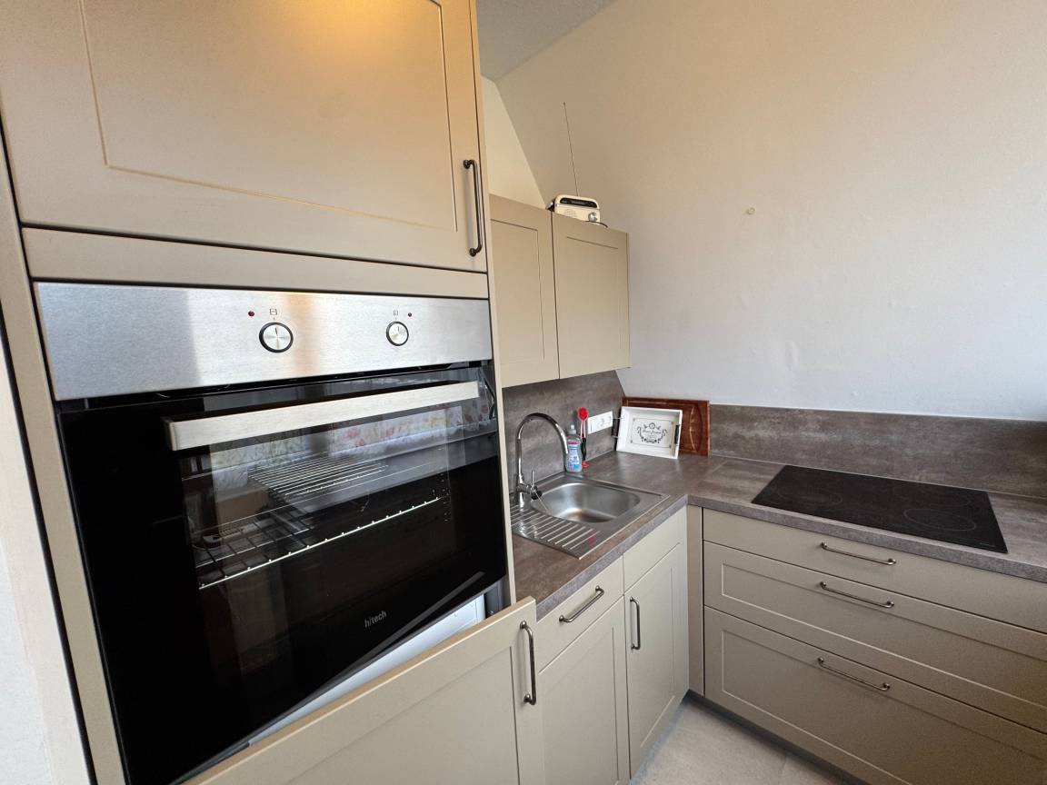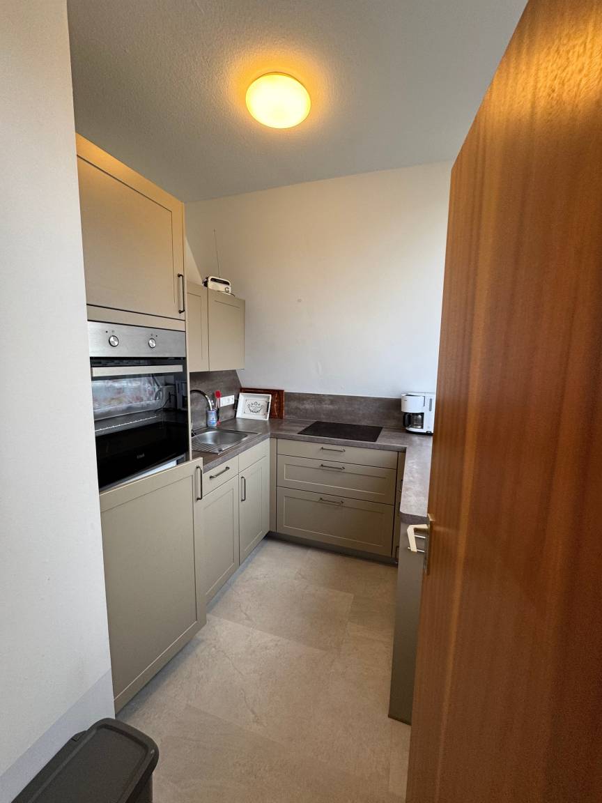 Küche: großer Kühlschrank mit Gefrierfach, Ofen/Kochfeld, Kaffeemaschine