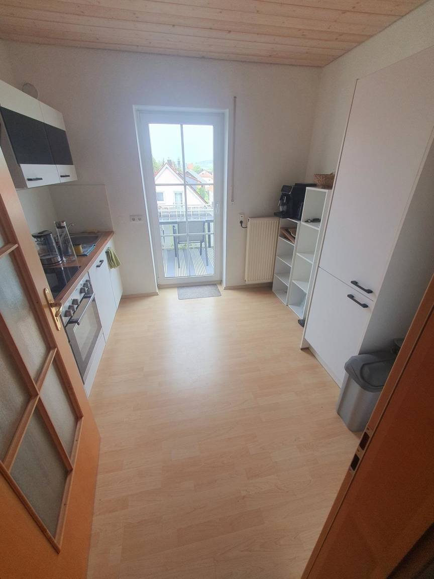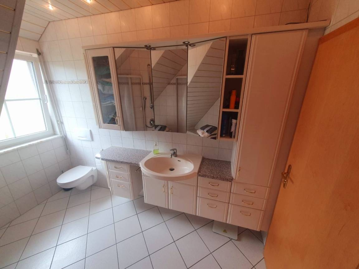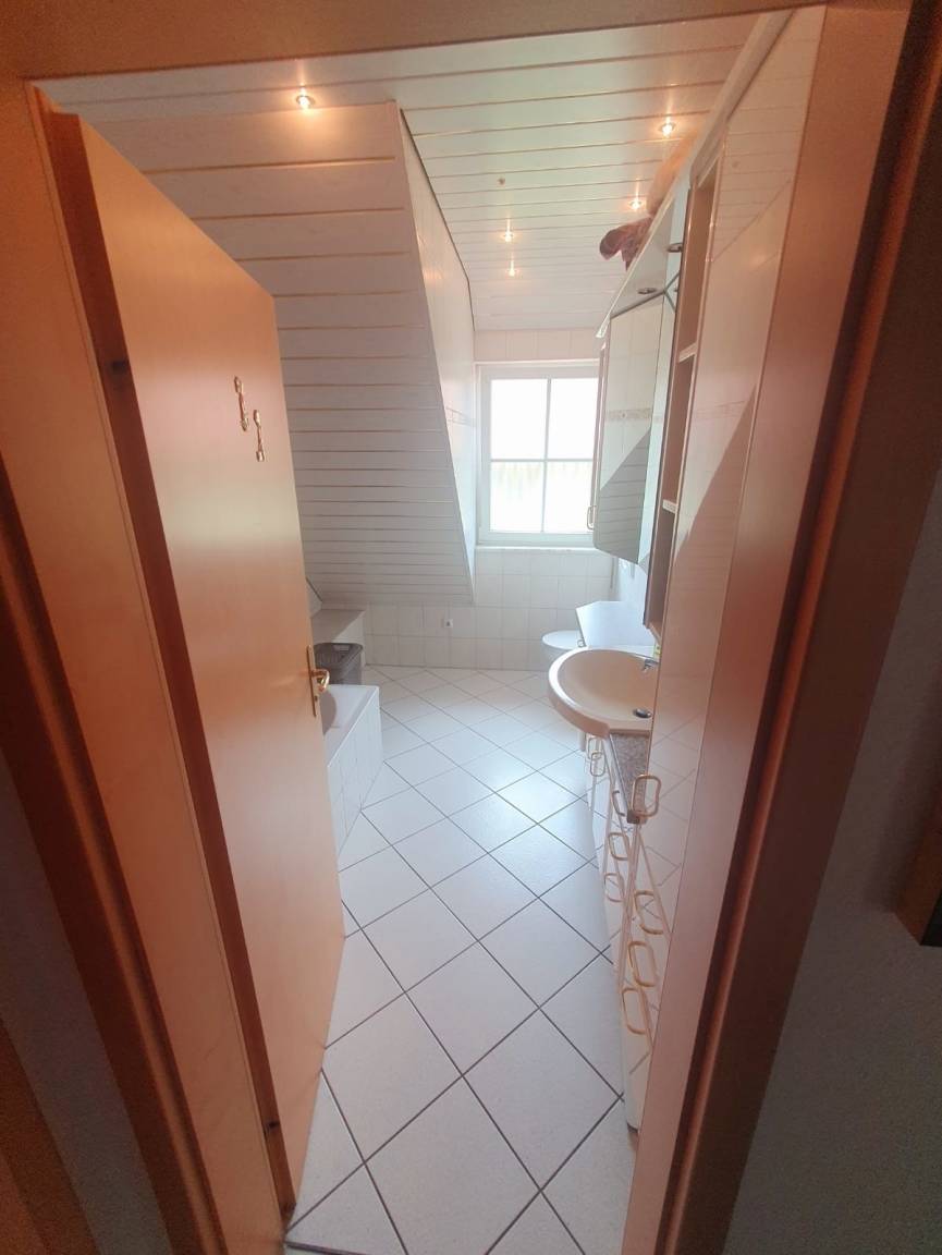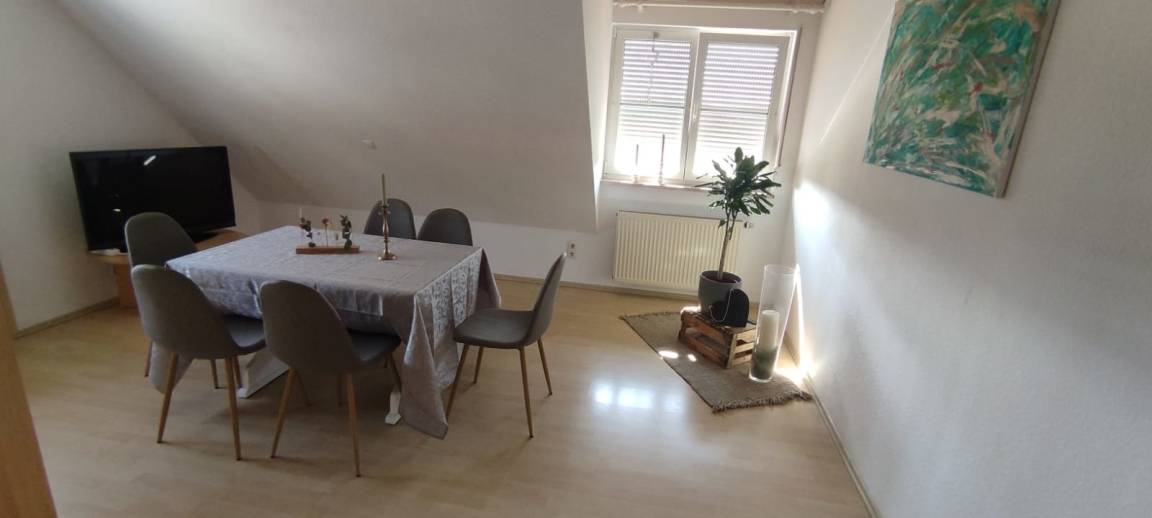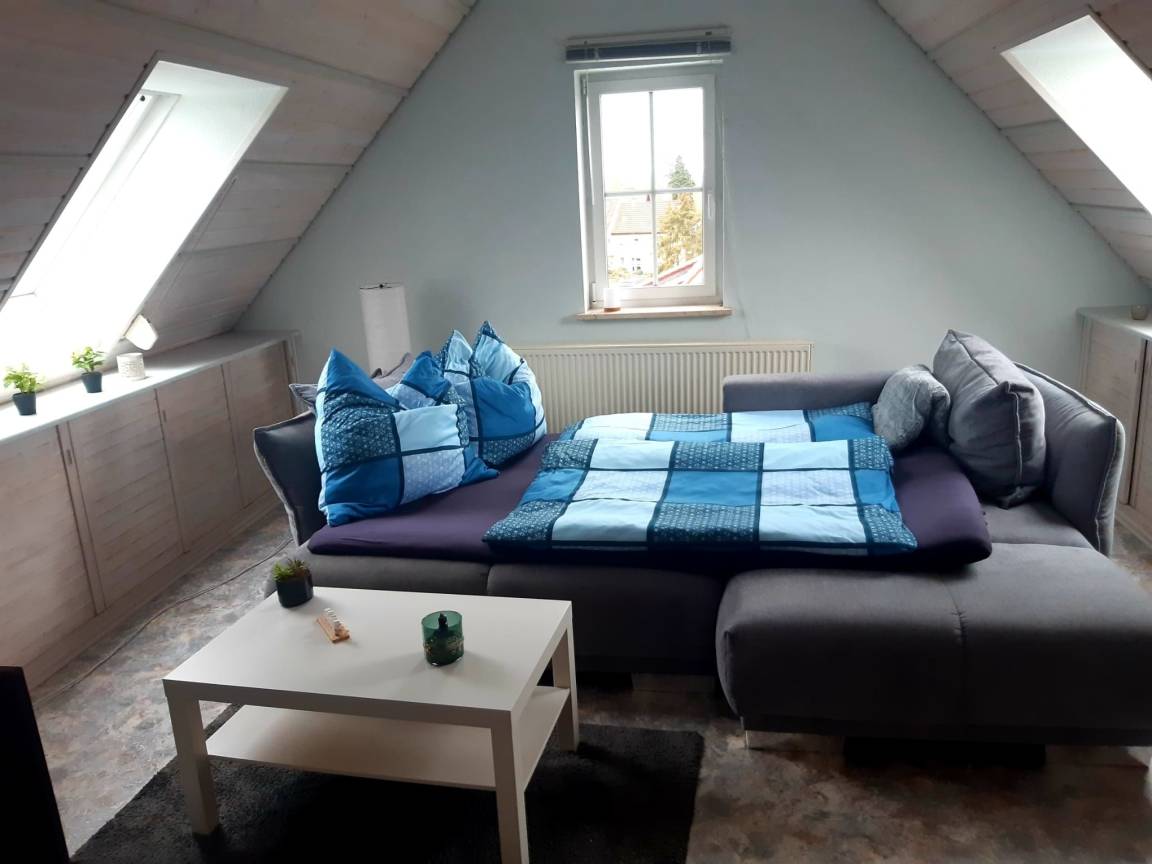 Die FeWo im Dachgeschoss kann bis zu sechs Personen beherbergen. Hier haben wir ein Schlafzimmer mit Doppelbett , ein Schlafzimmer mit zwei Einzelbetten und ein Schlafzimmer mit einer Kingsize Ausziehcouch im Spitzboden. Zudem gibt es ein Esszimmer mit Aufenthaltsbereich und Fernseher, eine Küche mit Balkon und ein Badezimmer.