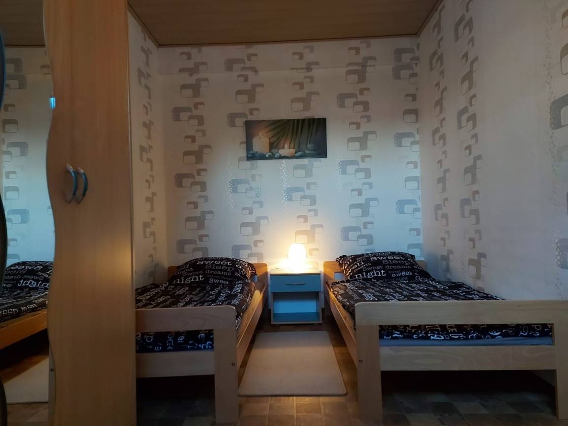 ein Schlafzimmer mit Doppelbett und ein Schlafzimmer mit zwei Einzelbetten, eine Küche mit