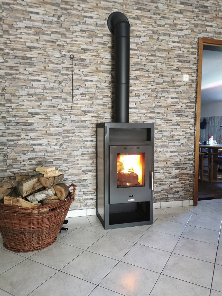 Eingang. Die ca. 90m² große Wohnung umfasst ein Wohnzimmer mit Essbereich und einem Holzofen,
