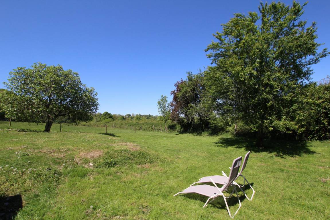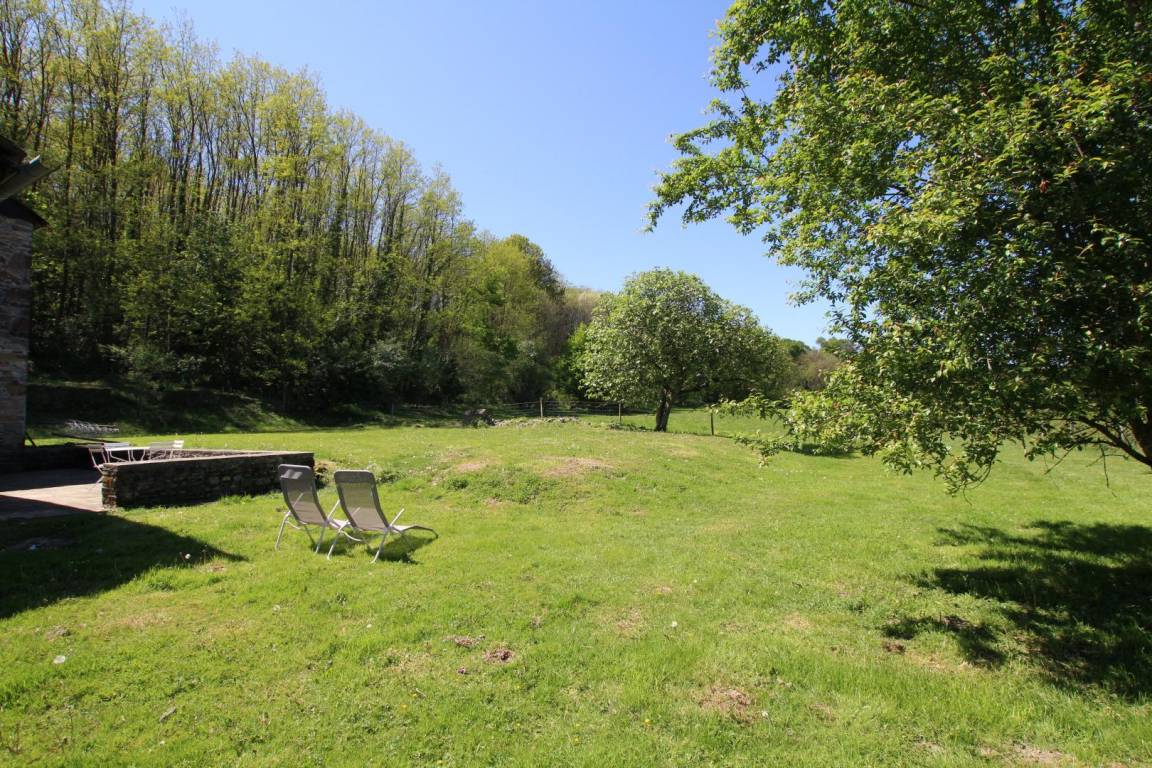 Vorne eingezäuntes Grundstück, Wiese und Wald von 5000 m², überdachte Terrasse 60 m², Gartenmöbel, Grill.