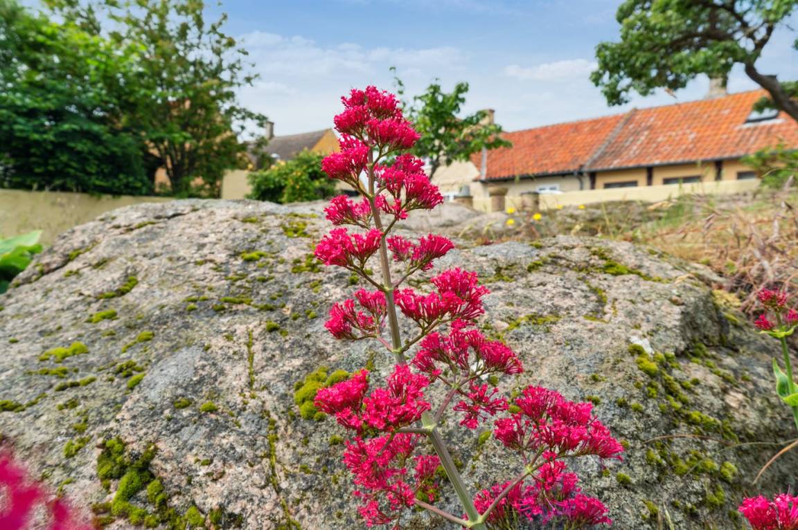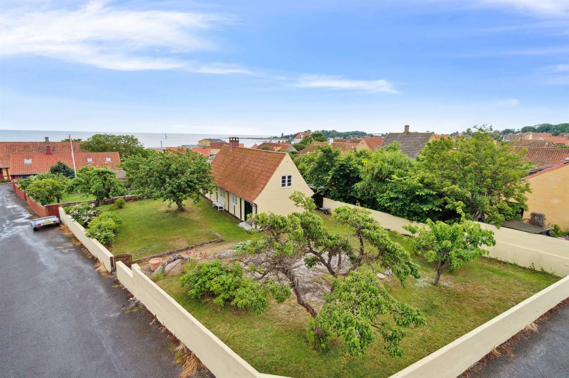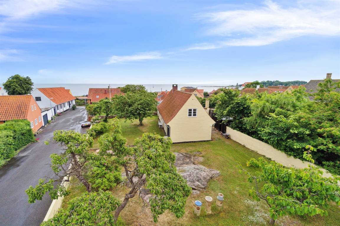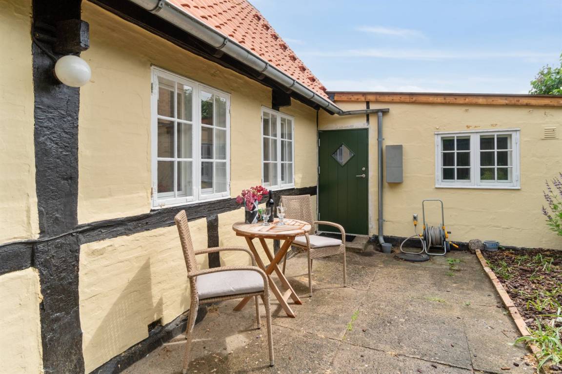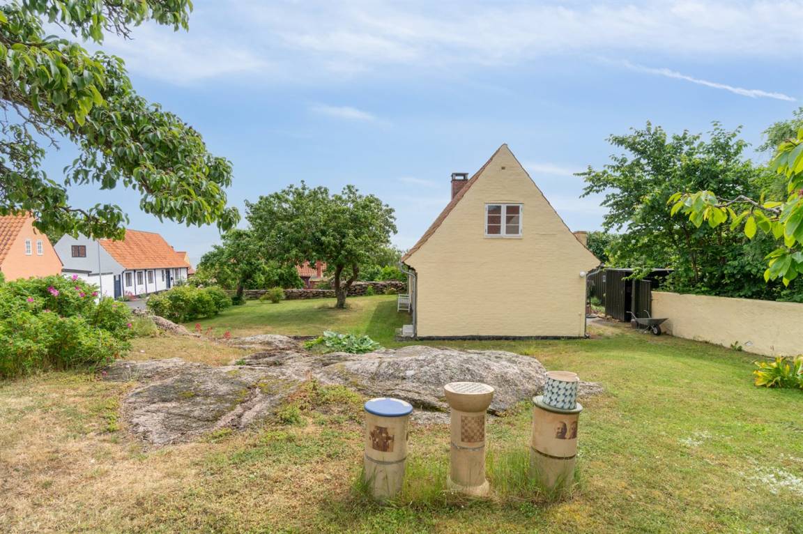 Rund um das Haus gibt es einen alten Garten mit sehr großen Felsvorsprüngen. Eine geschlossene Sonnenterrasse und ein gemütlicher Hof laden dazu ein, den Morgenkaffee zu genießen, wenn die Sonne über Dänemarks östlichster Handelsstadt aufgeht.
