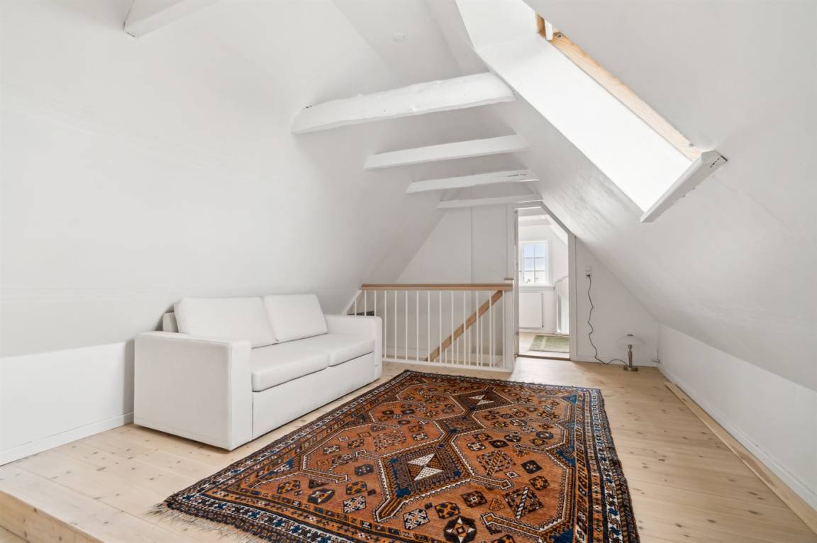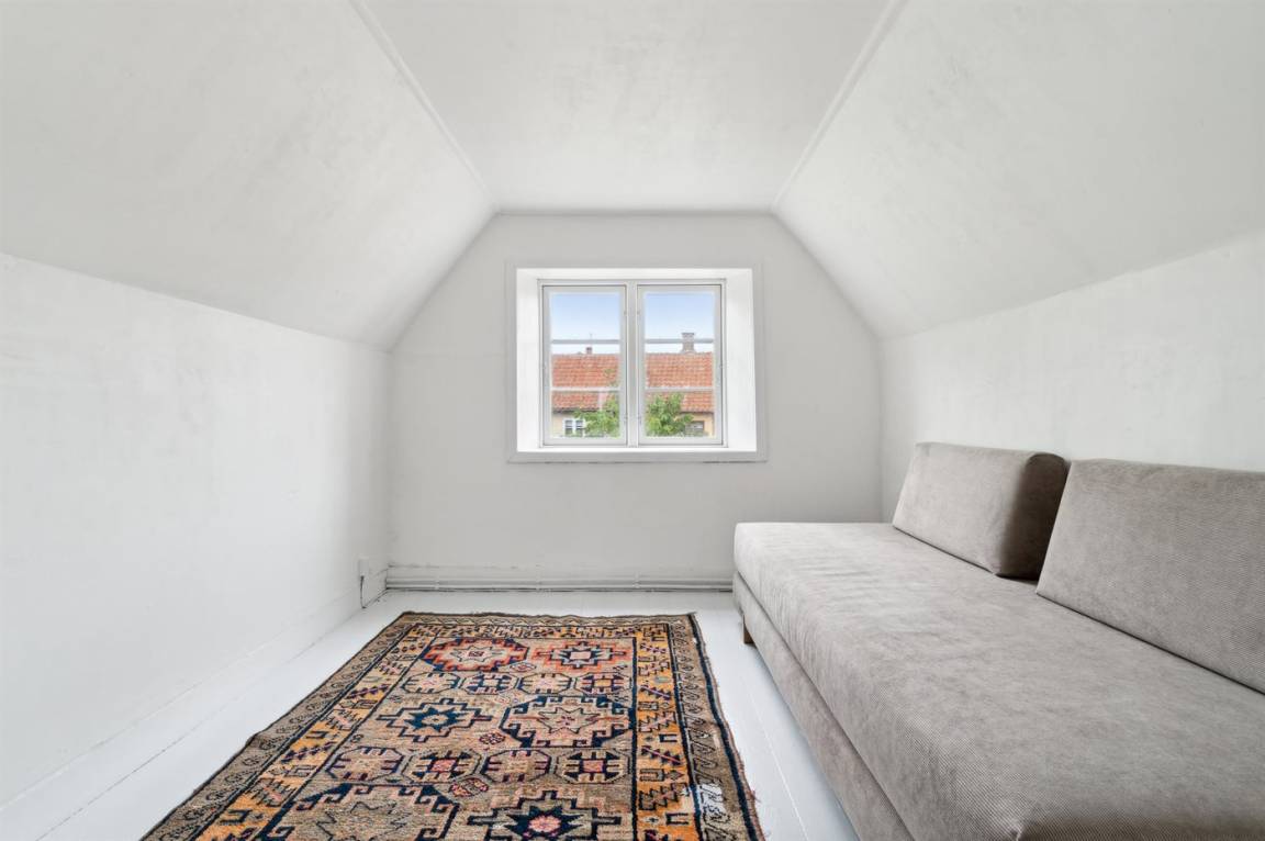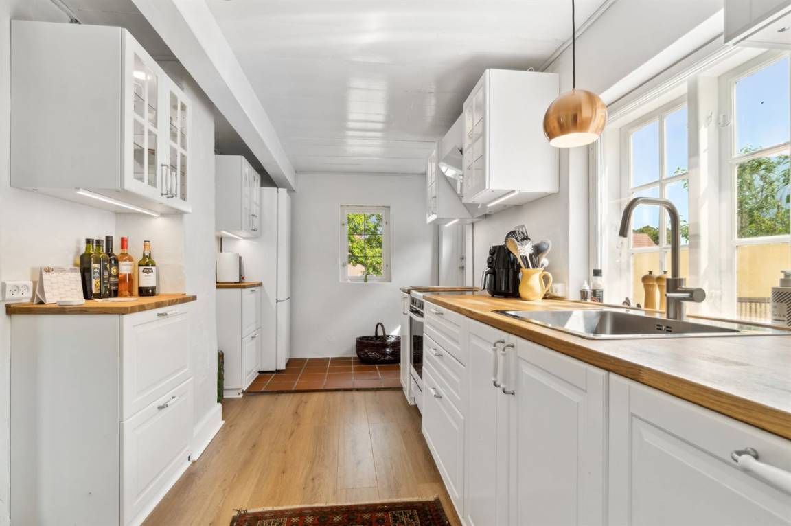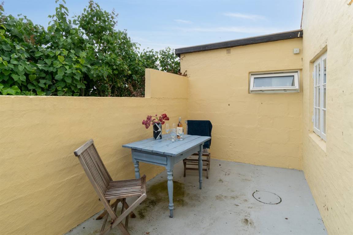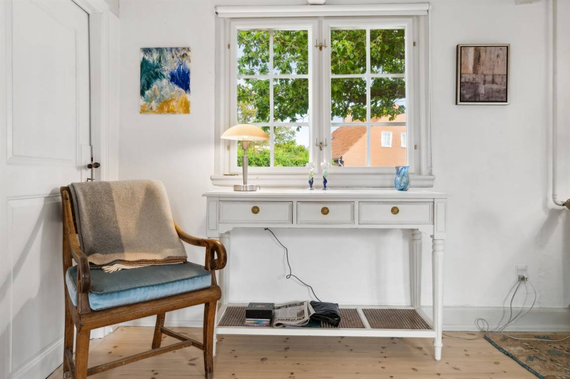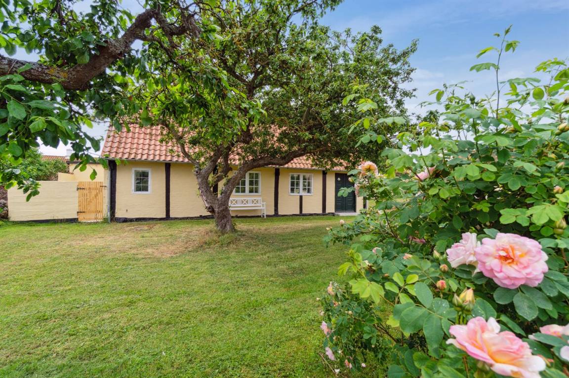 Rund um das Haus gibt es einen alten Garten mit sehr großen Felsvorsprüngen. Eine geschlossene Sonnenterrasse und ein gemütlicher Hof laden dazu ein, den Morgenkaffee zu genießen, wenn die Sonne über Dänemarks östlichster Handelsstadt aufgeht.