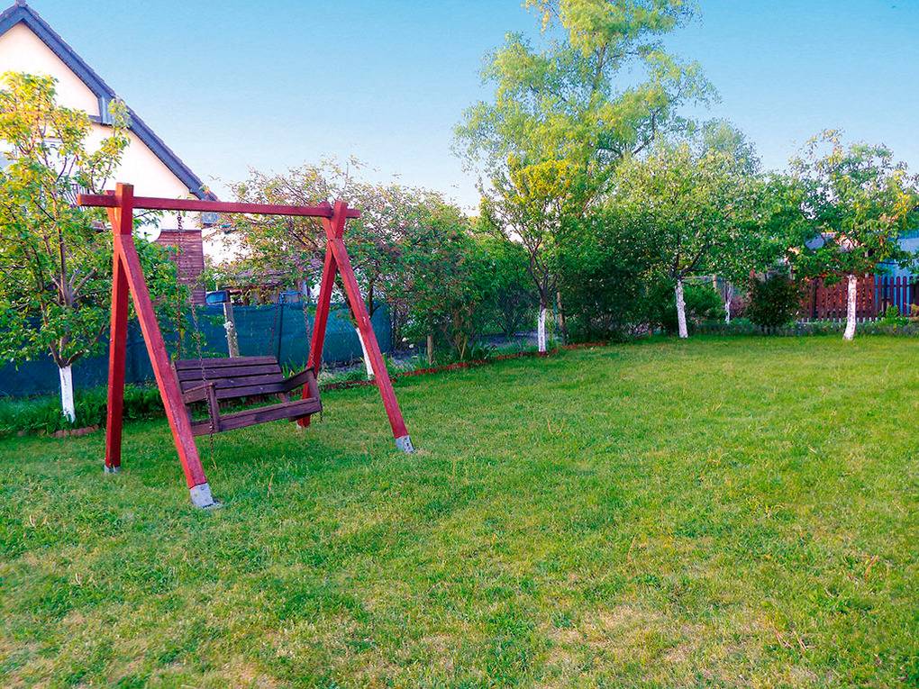 Haus: Zwei schöne Ferienhäuser, 2015 erbaut. Ruhige Lage auf einem gepflegten Rasengrundstück (850 qm). Gemütliche Ferienhäuser mit freundlicher Einrichtung. Kostenloses Internet über WLan. E-Heizung, Warmwasser über Durchlauferhitzer. Große Terrasse mit Sitzmöbeln, Grill. Kinderspielplatz mit Trampolin, Hollywood-Schaukel zur gemeinschaftlichen Nutzung. Separates Grillhäuschen. 1 Parkplatz/Ferienhaus auf dem umzäunten Grundstück inklusiv. Zweiter Parkplatz gegen Gebühr..