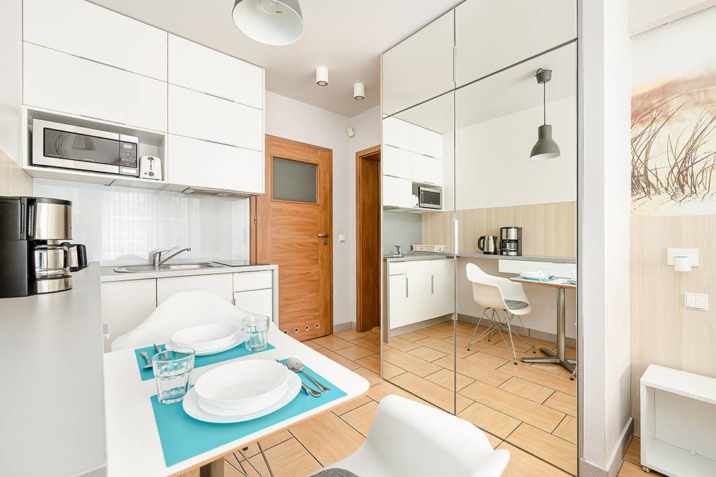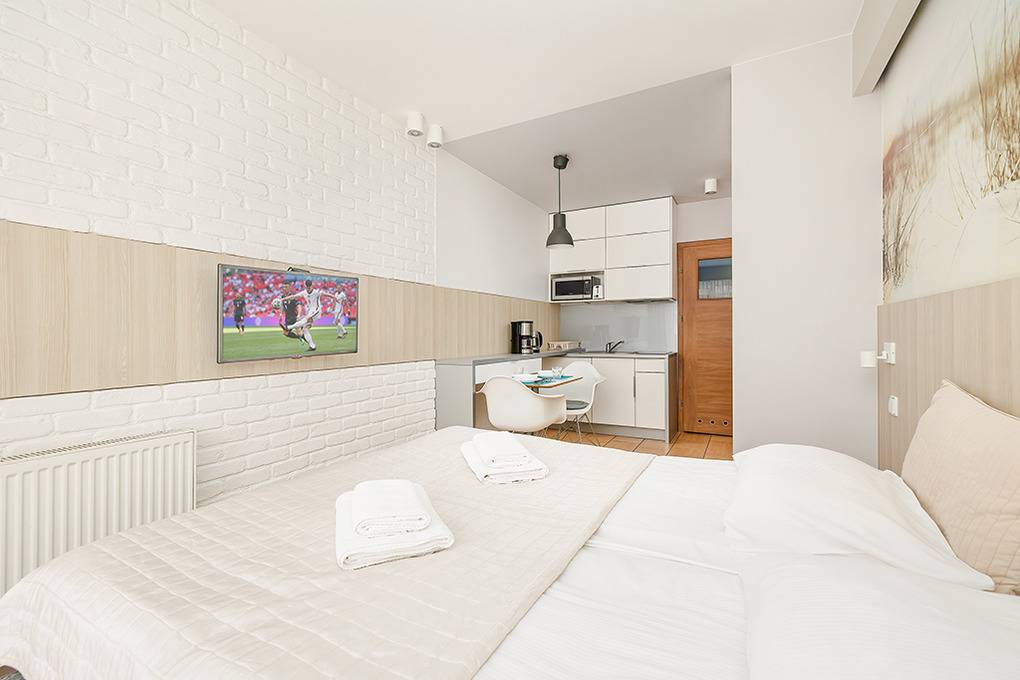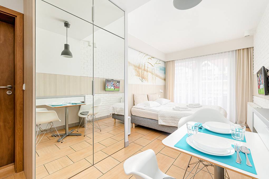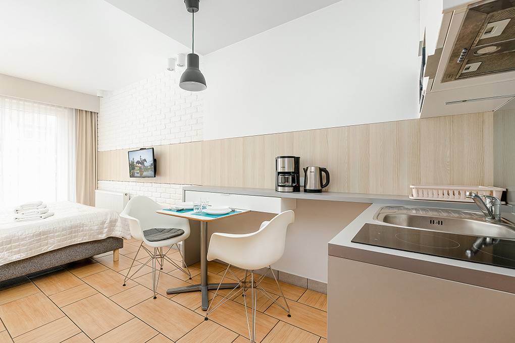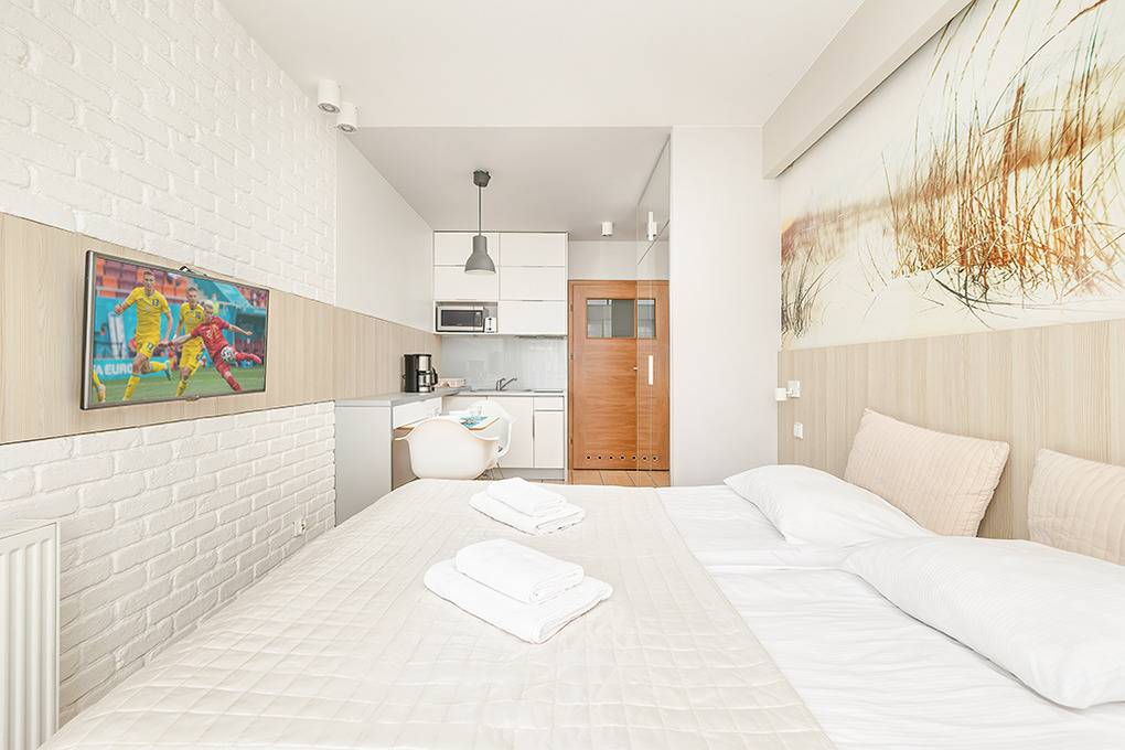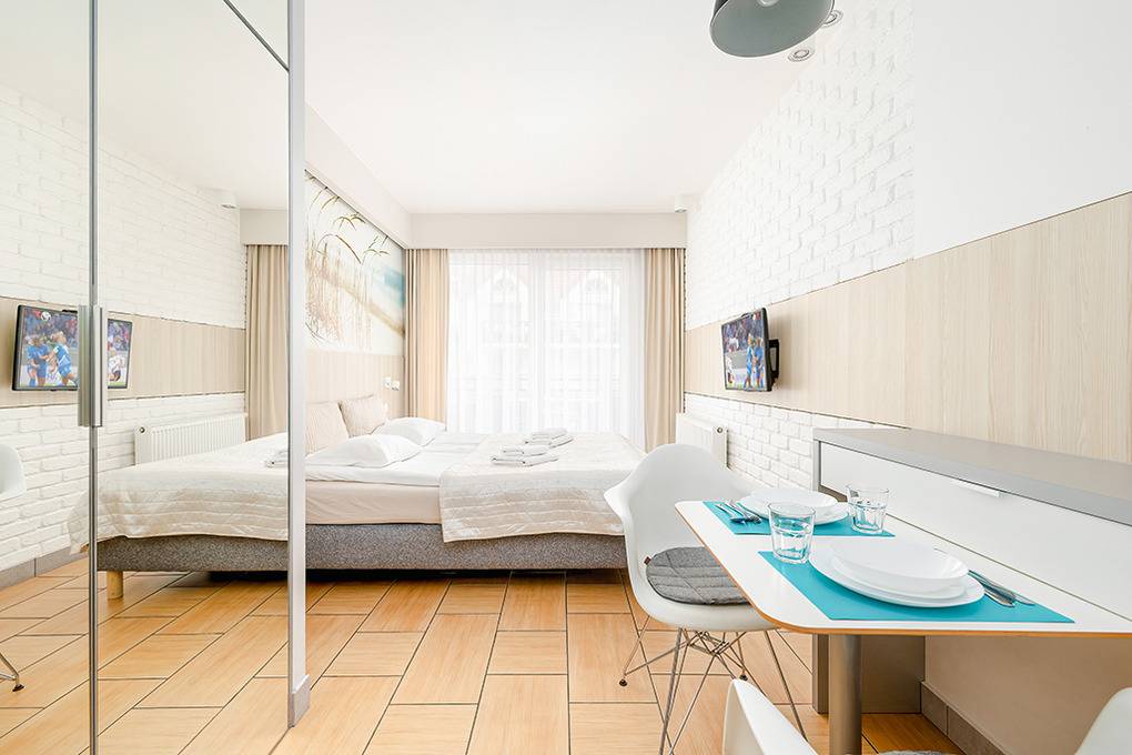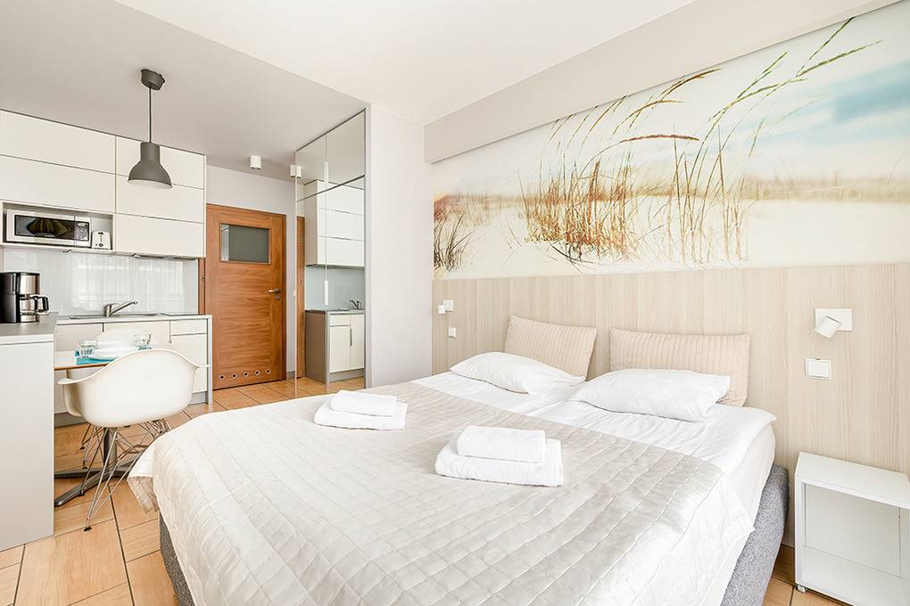 PL 11.26 Wohnung 2 Pers.: Gemütliche 1-Zimmerwohnung mit 24 qm Wohnfläche, 1 OG. Wohn-/Essraum mit bodentiefen Festern, Doppelbett, Flachbild Kabel-TV mit deutschen Programmen, Internet (WiFi), Esstisch, Küchenzeile (2 E-Platten Induktion, Mikrowelle). Doppelbett. Bad/WC. Teilüberdachter Balkon mit Sitzmöbeln, Blick auf den anliegenden Park.