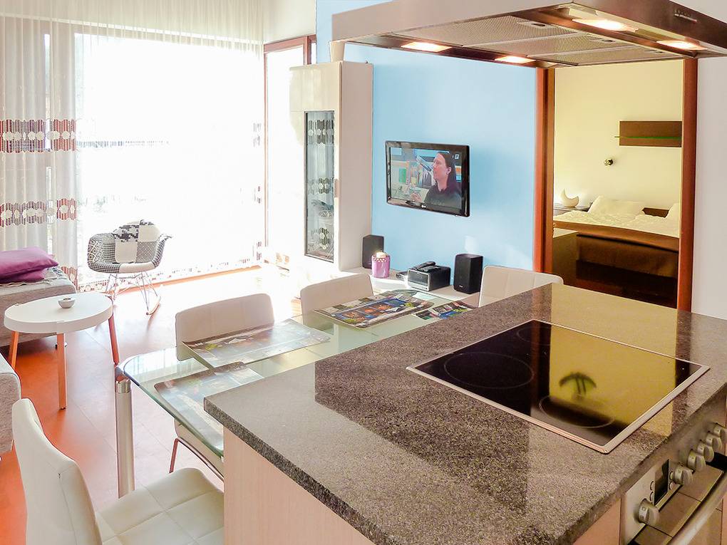 PL 11.23 Wohnung 2-4 Pers.: Stilvolle 2-Zimmerwohnung mit 40 qm Wohnfläche, Hochparterre. Wohn-/Essraum mit Sitzgarnitur (Ausziehsofa 2 Pers), Flachbild Kabel-TV (dt. Programme), Internet (Wlan), Esstisch, moderner Küchenzeile (4 E-Pl. Ceranfeld, Backofen, Tiefkühlfach 30 l, Spülmaschine, Abdunsthaube). Doppelzimmer. Bad/WC. Große, teils überdachte Terrasse (30 qm) mit Hollywood-Schaukel und Sitzmöbeln.