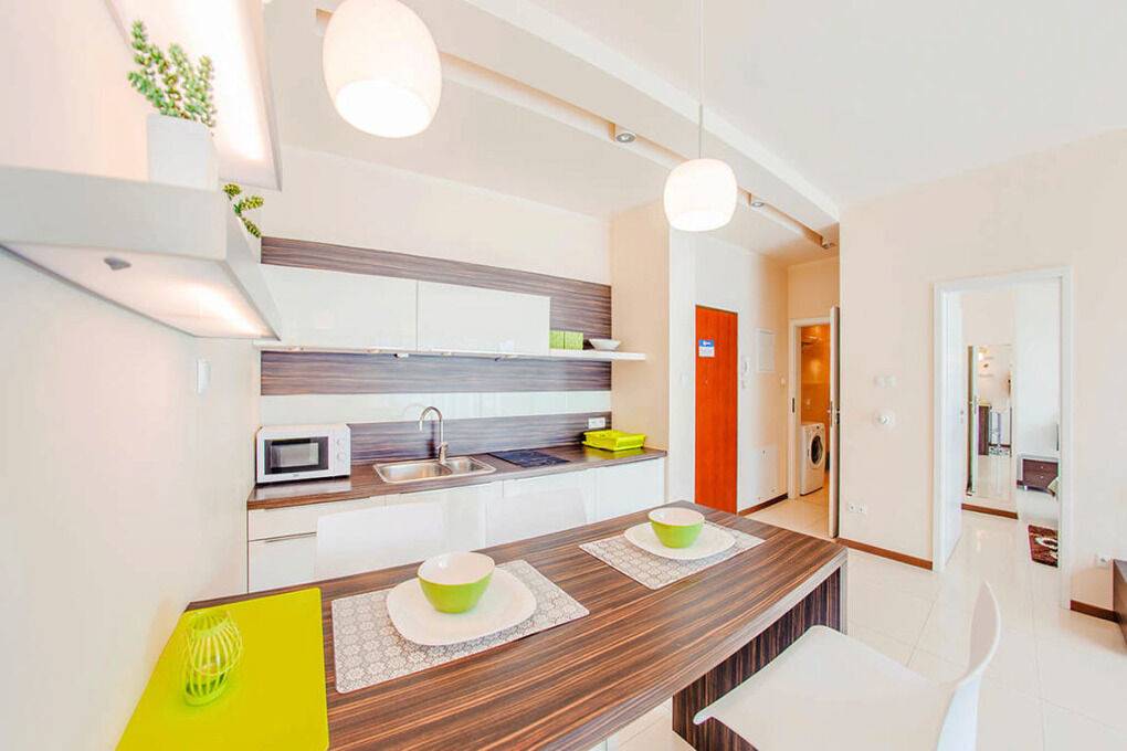 Wir bieten Ihnen Apartments gleich an einem breiten Sandstrand an. Im Teil der Apartments gibt es eine schöne Aussicht aufs Meer.