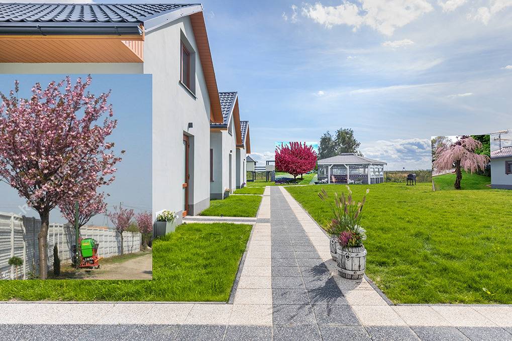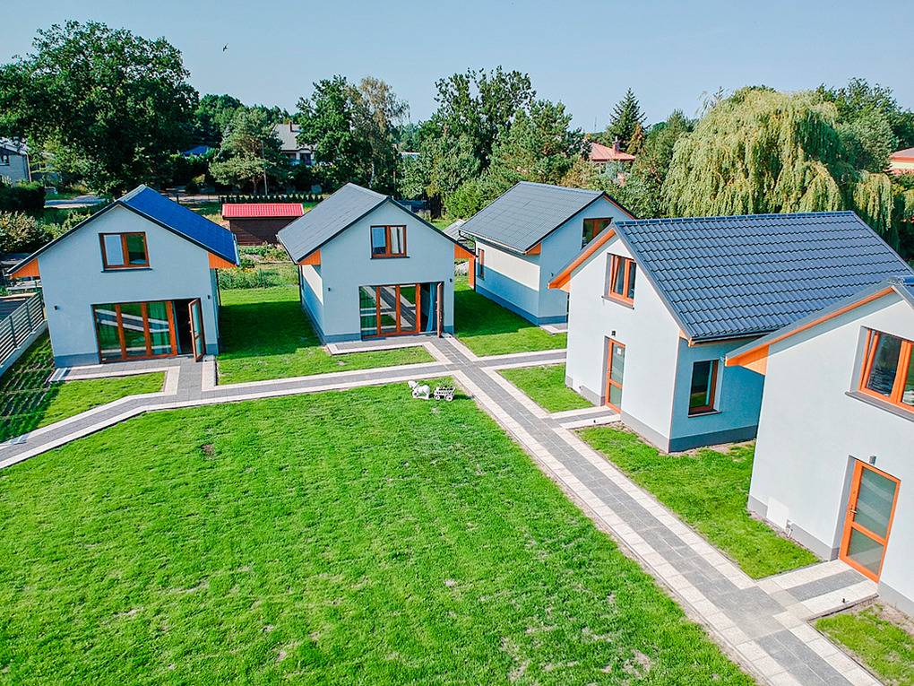 Haus: Sechs schöne Ferienhäuser, 2021 neu erbaut. Ruhige Lage auf einem gepflegten Rasengrundstück (1800 qm). In der Anlage: Pavillon mit Sitzmöbeln und Grill zur gemeinsamen Nutzung. Kinderspielplatz mit Trampolin, Schaukeln, kleinem Klettergerüst, Sandkasten, Rutsche.