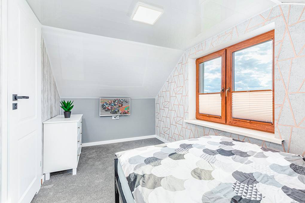 PL 11.242 Ferienhaus 2-7 Pers.: Mit Liebe zum Detail eingerichtetes 3-Zimmerhaus mit 68 qm Wohnfläche über 2 Etagen. Parterre: Freundlicher Wohn-/Essraum mit bodentiefen Fenstern, rustikaler Holzbalkendecke, Eckcouch (Schlafsofa 2 Pers.), Smart-Flachbild-TV mit dt. Programmen, Esstisch, Küchenzeile (2 Induktionsplatten). Bad: Du, Wb, WC. Vom Wohnraum Holztreppe in die 1. Etage: Doppelzimmer mit Smart-Flachbild-TV. 3-Bettzimmer mit 3 Einzelbetten. Terrasse mit Sitzmöbeln.