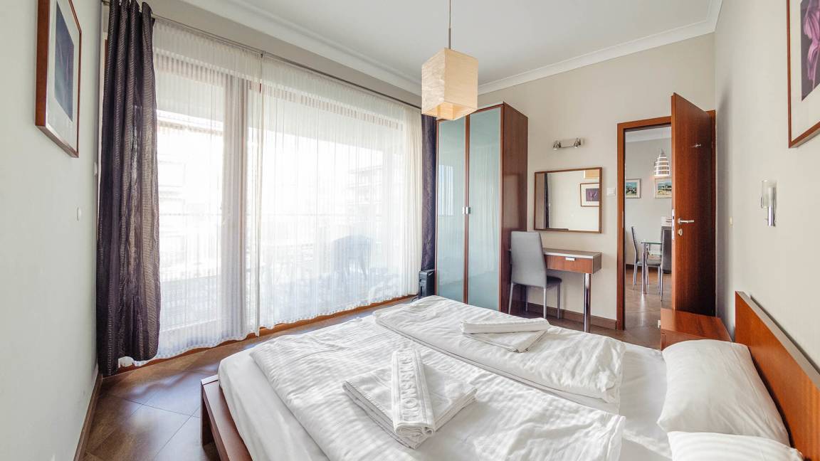 Wir bieten Ihnen Apartments gleich an einem breiten Sandstrand an. Im Teil der Apartments gibt es eine schöne Aussicht aufs Meer.