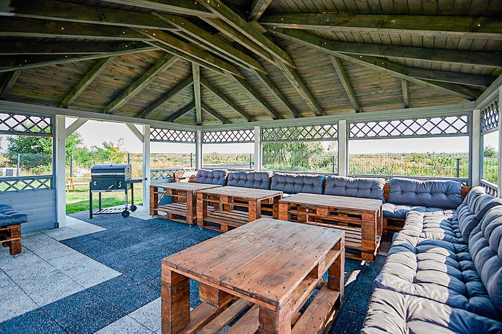 Haus: Sechs schöne Ferienhäuser, 2021 neu erbaut. Ruhige Lage auf einem gepflegten Rasengrundstück (1800 qm). In der Anlage: Pavillon mit Sitzmöbeln und Grill zur gemeinsamen Nutzung. Kinderspielplatz mit Trampolin, Schaukeln, kleinem Klettergerüst, Sandkasten, Rutsche.