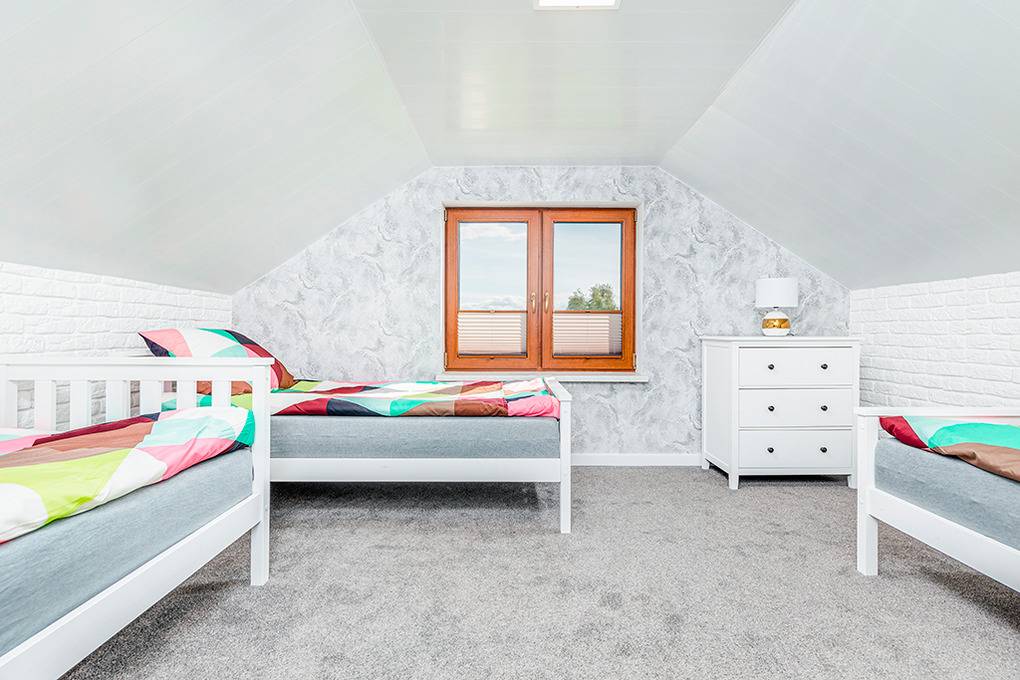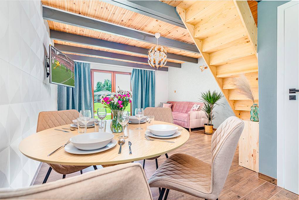 PL 11.242 Ferienhaus 2-7 Pers.: Mit Liebe zum Detail eingerichtetes 3-Zimmerhaus mit 68 qm Wohnfläche über 2 Etagen. Parterre: Freundlicher Wohn-/Essraum mit bodentiefen Fenstern, rustikaler Holzbalkendecke, Eckcouch (Schlafsofa 2 Pers.), Smart-Flachbild-TV mit dt. Programmen, Esstisch, Küchenzeile (2 Induktionsplatten). Bad: Du, Wb, WC. Vom Wohnraum Holztreppe in die 1. Etage: Doppelzimmer mit Smart-Flachbild-TV. 3-Bettzimmer mit 3 Einzelbetten. Terrasse mit Sitzmöbeln.