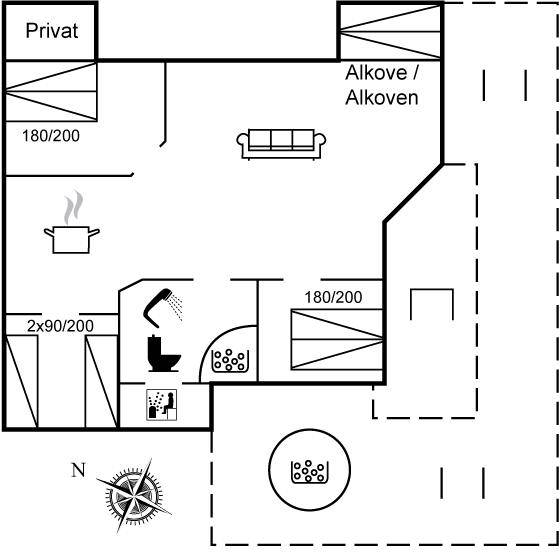 DraußenDie Ferienunterkunft liegt auf einem 1050 m² großen Gartengrundstück. Die Entfernung zum Meer beträgt 400 m. Es gibt einen Badesteg in der Nähe. Die nächste Einkaufsmöglichkeit liegt 4000 m entfernt. In einem Abstand von 14000 m gibt es einen Golfplatz. Es steht ein offenes Terrassenareal zur Verfügung. Außerdem gibt es überdachte Terrasse. Geräteraum. Die Entfernung zu einem Spielplatz beträgt 500 m. Es steht ein Grill zur Verfügung. Parkplatz auf dem Grundstück.