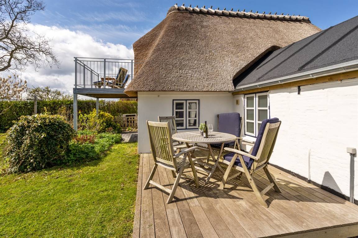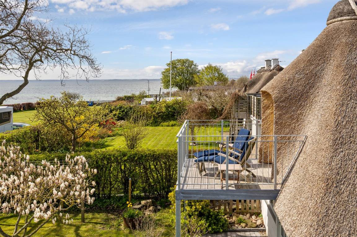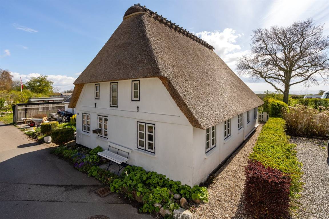 Schön gelegenes Ferienhaus mit Reetdach und Sprossenfenstern, Blick aufs Wasser und Zugang zu einem herrlichen geschlossenen Garten – eine gemütliche kleine Oase auf Kegnæs.
