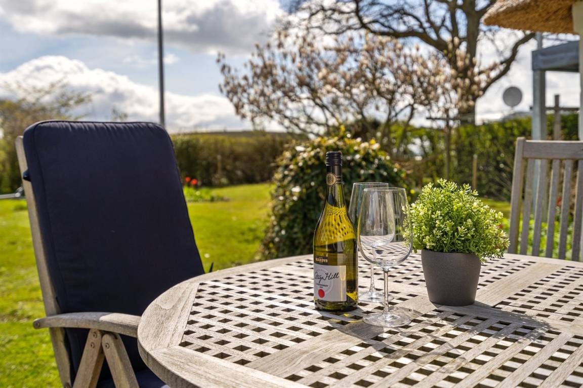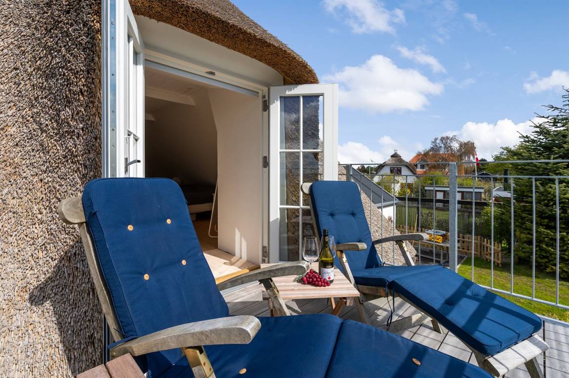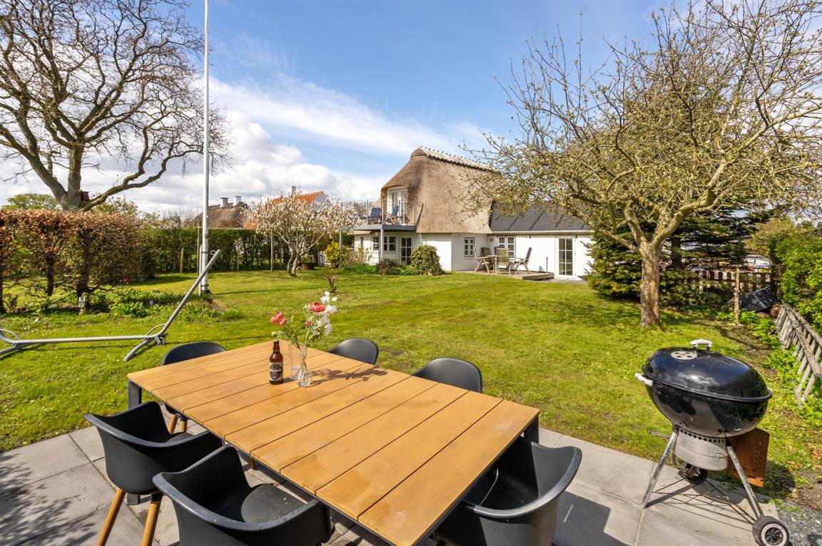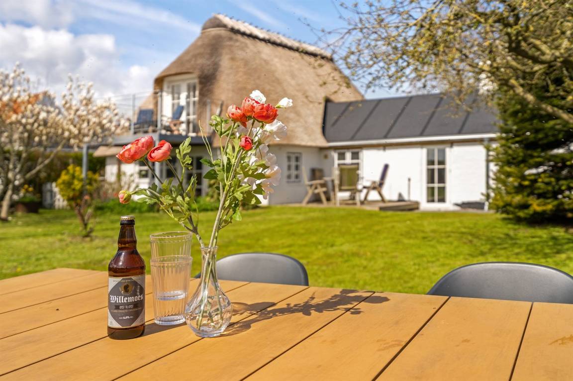 Schön gelegenes Ferienhaus mit Reetdach und Sprossenfenstern, Blick aufs Wasser und Zugang zu einem herrlichen geschlossenen Garten – eine gemütliche kleine Oase auf Kegnæs.