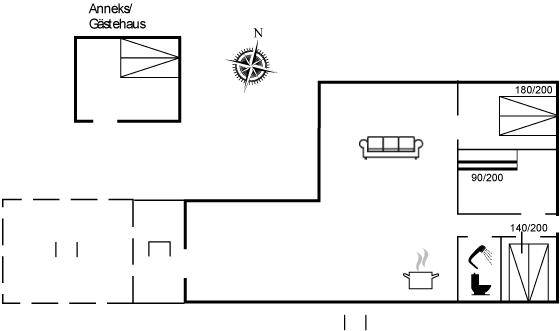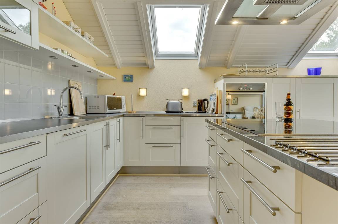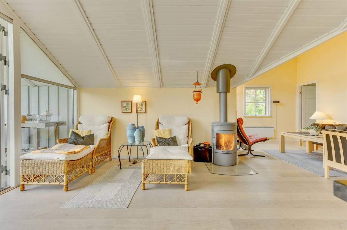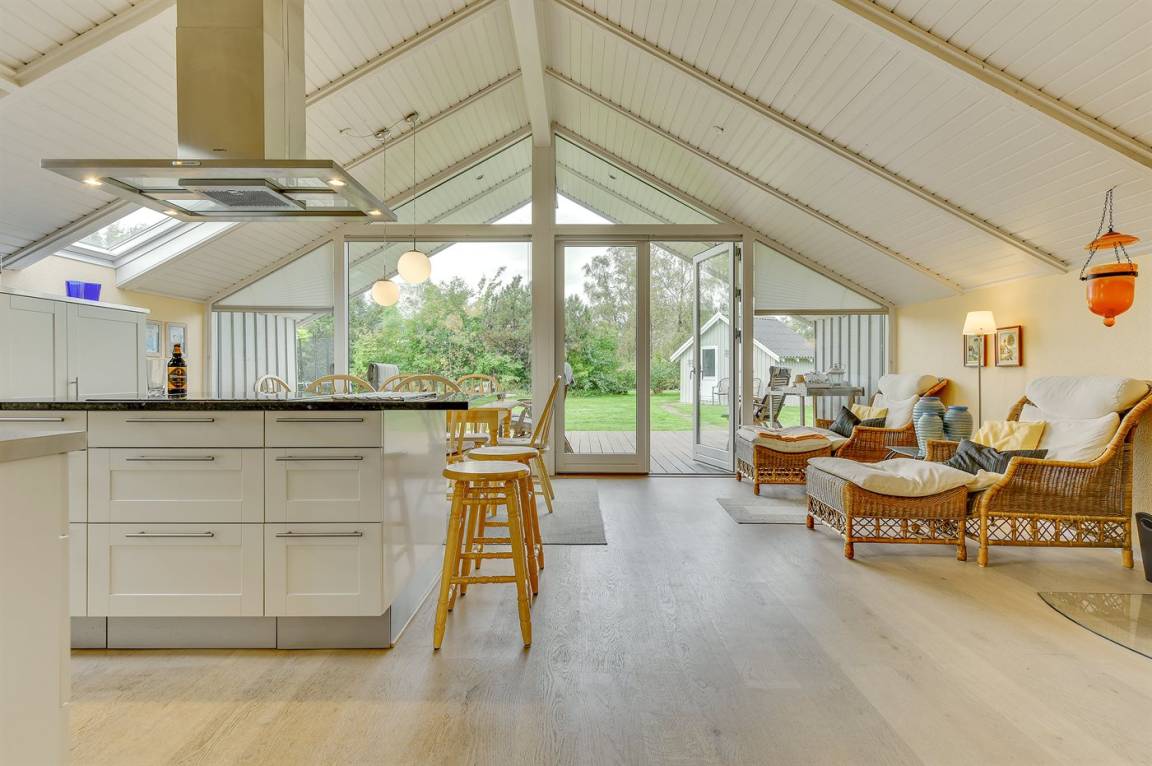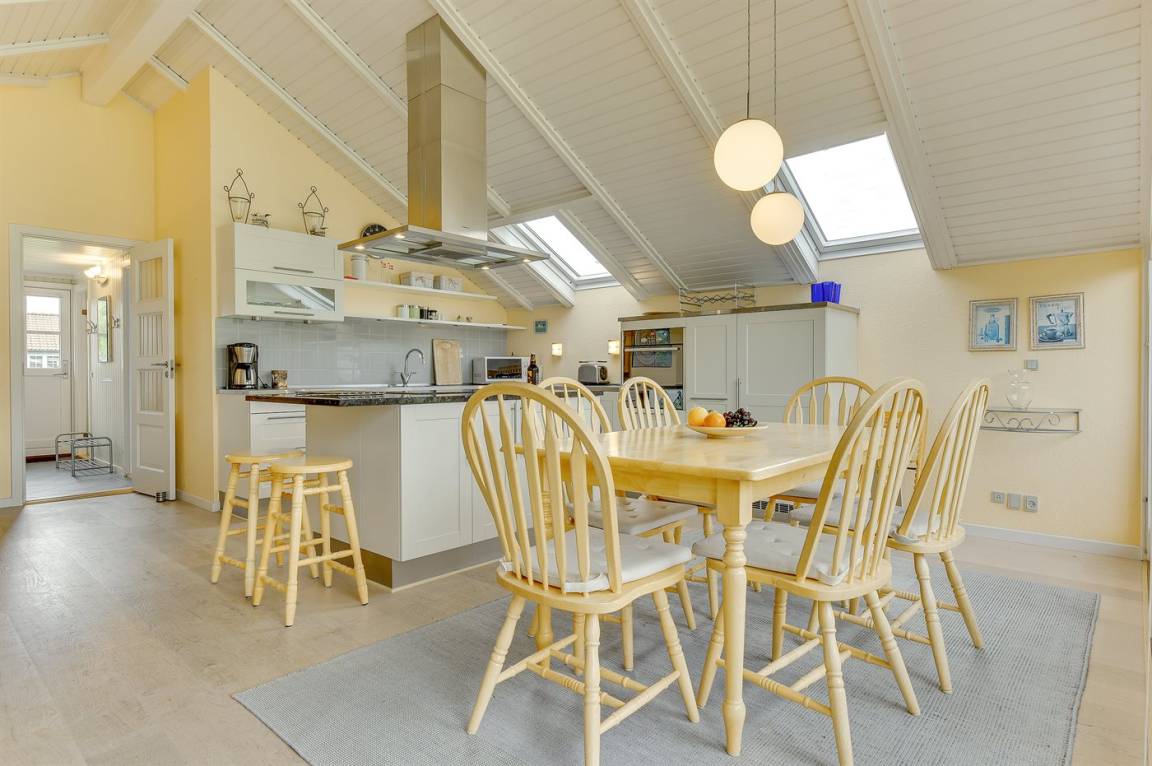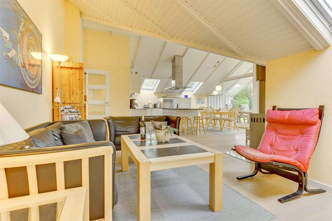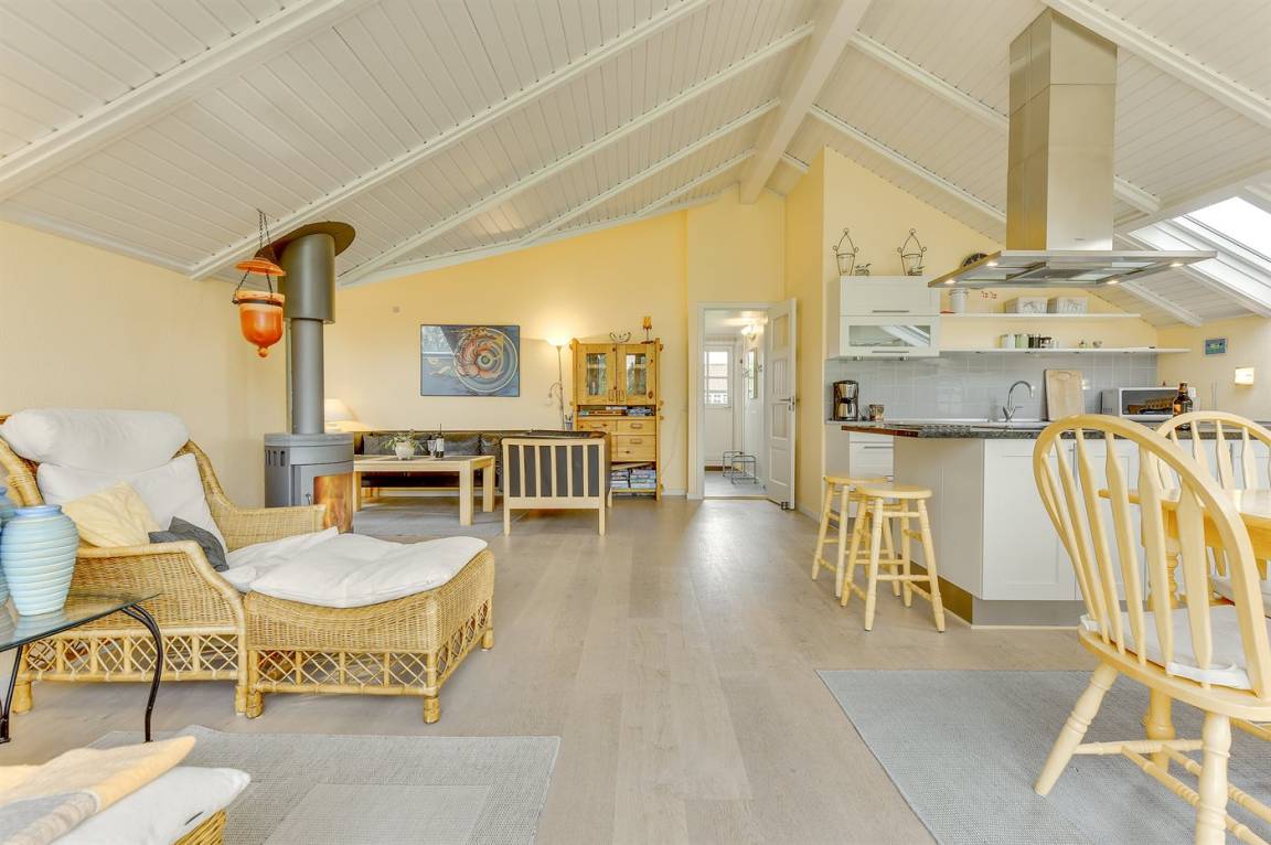 Hübsche, offene Wohnküche mit u. a. Geschirrspüler, Mikrowelle, kleinem Tiefkühlgerät, Umluftofen und Herd mit Ceran-Feld. Gemütliches Wohnzimmer mit Kaminofen, TV mit digitalem Satellitenanschluss, DVD-Spieler und Stereoanlage mit CD-Spieler sowie Zutritt zur überdachten Terrasse. Die Schlafplätze verteilen sich auf 3 gute Schlafzimmer; 2 mit Doppelbett und 1 mit Etagenbett. Ferner Gästehaus mit 2 Schlafplätzen.