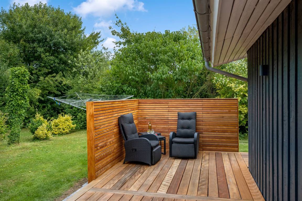 DraußenDie Ferienunterkunft liegt auf einem 891 m² großen Gartengrundstück. Die Entfernung zum Meer beträgt 500 m. Die nächste Einkaufsmöglichkeit liegt 1800 m entfernt. In einem Abstand von 12000 m gibt es einen Golfplatz. Es steht ein offenes Terrassenareal zur Verfügung. Außerdem gibt es überdachte Terrasse. Schaukel. Sandkasten. Es steht ein Grill zur Verfügung. Parkplatz auf dem Grundstück.