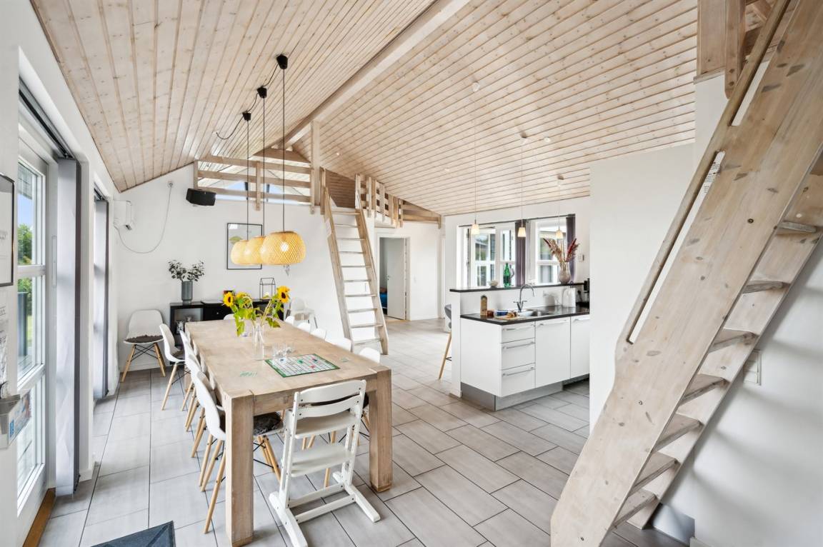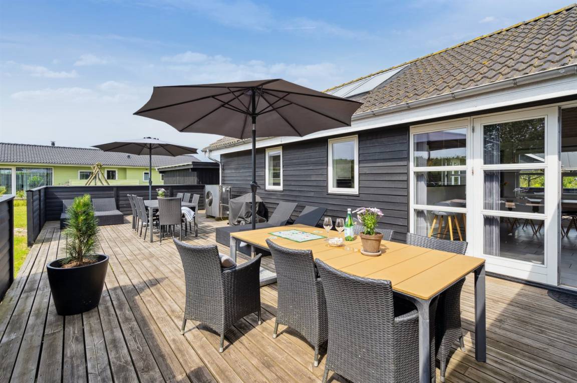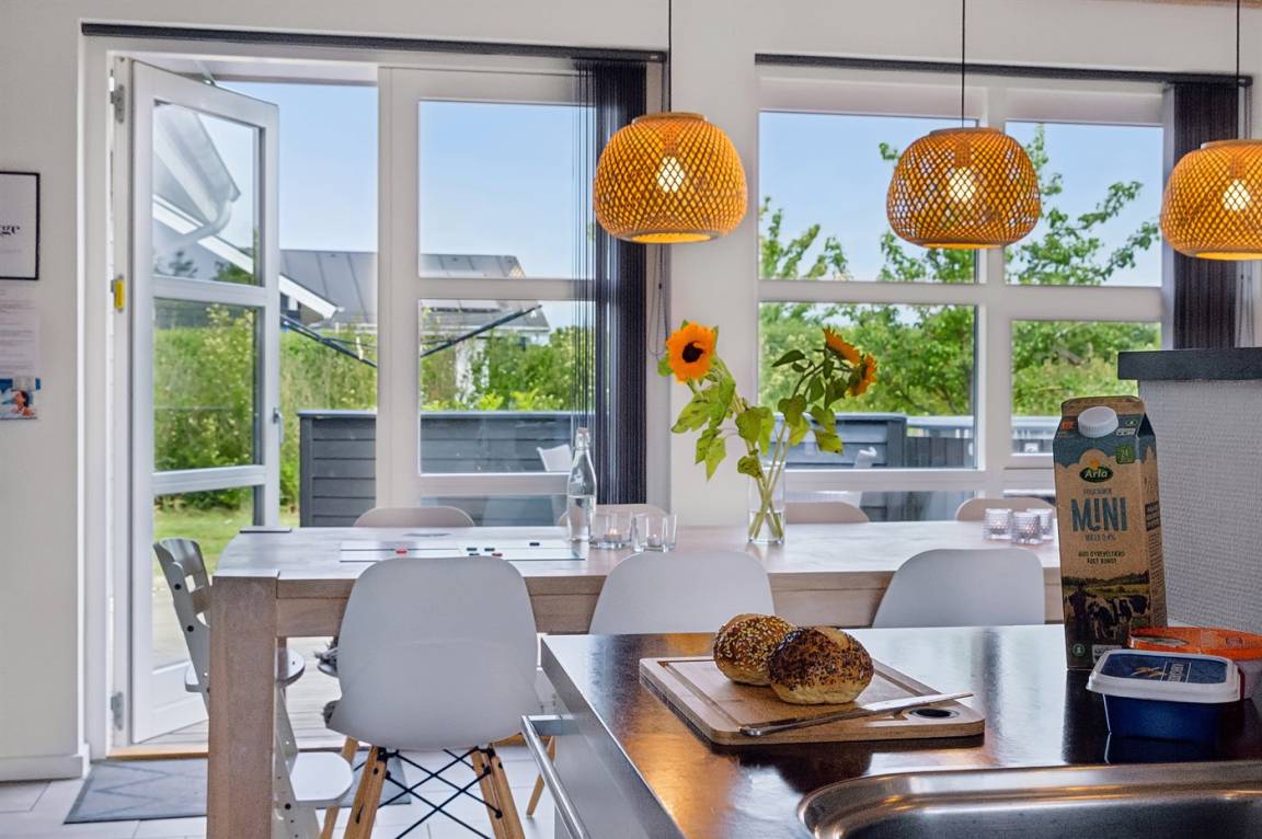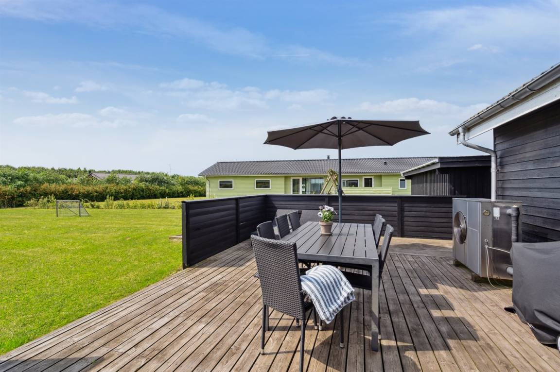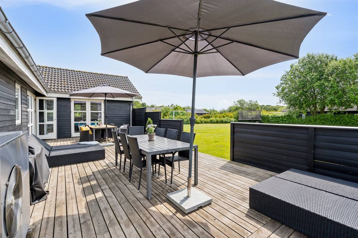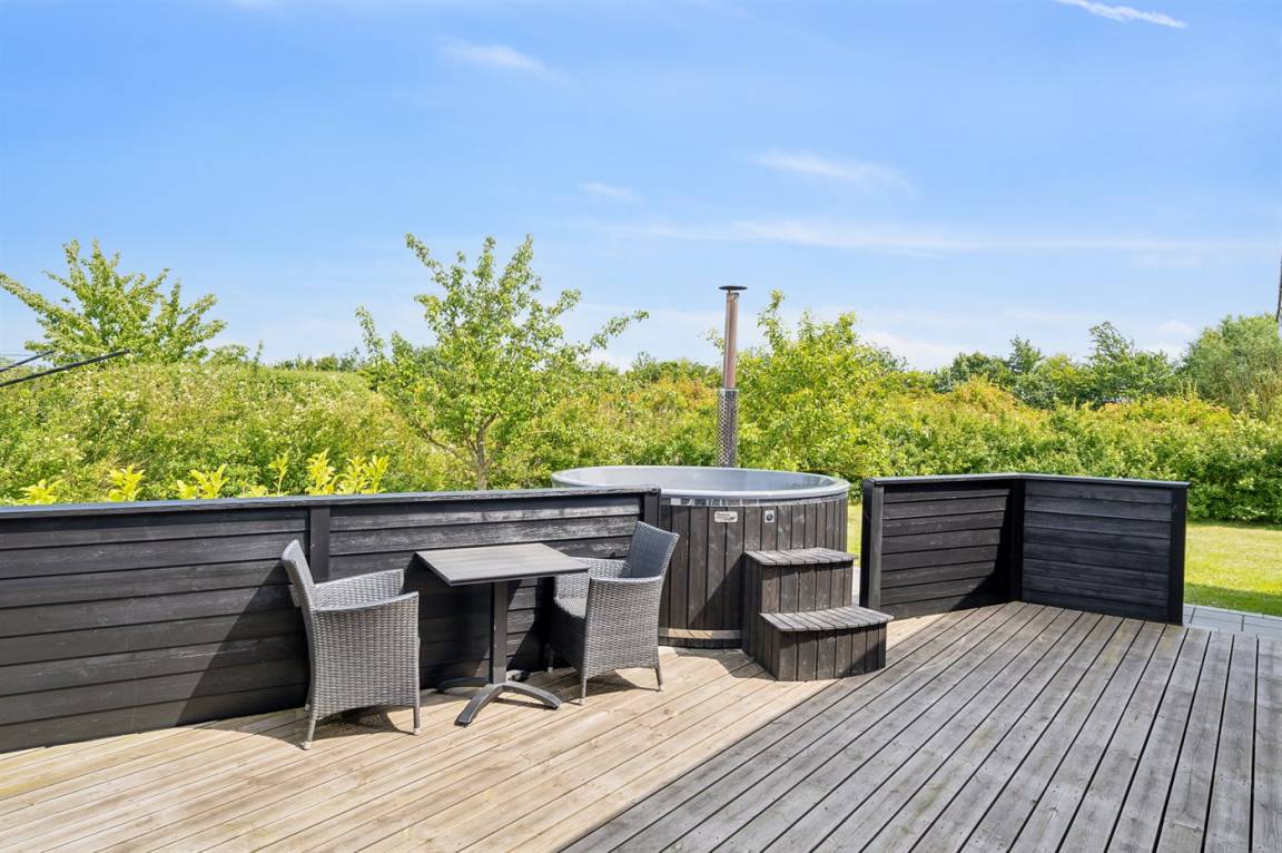 Das Ferienhaus liegt auf einem 1400 m² großen Gartengrundstück. Es sind 900 m bis zum Meer. Die nächste Einkaufsmöglichkeit, ein Minigolf/Grill/Minimarkt, liegt in einer Entfernung von 1300 m. Der Kaufmann Dagli'Brugsen und ein Bäcker liegen 2700 Meter entfernt. Es gibt einen Golfplatz in einer Entfernung von 12000 m. Zum Ferienhaus gehören 2 offene Terrassen, eine davon mit einem Hot-Tub, der mit mitgebrachtem Holz beheizt wird. Schaukel. Sandkasten. Fußballtor. Außenspiele. Grill zur Verfügung. Es ist eine Steckdose für das Laden von Elektroautos installiert. Typ 2 Steckdose. Mit 11 kW Ladeleistung. Parken am Ferienhaus.