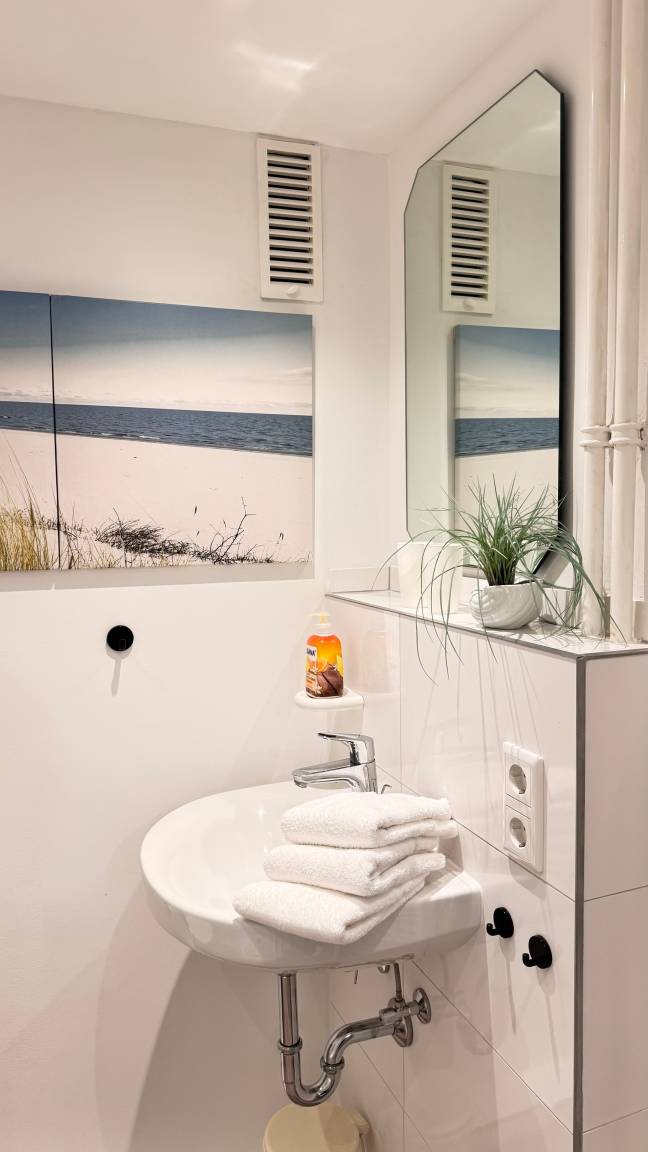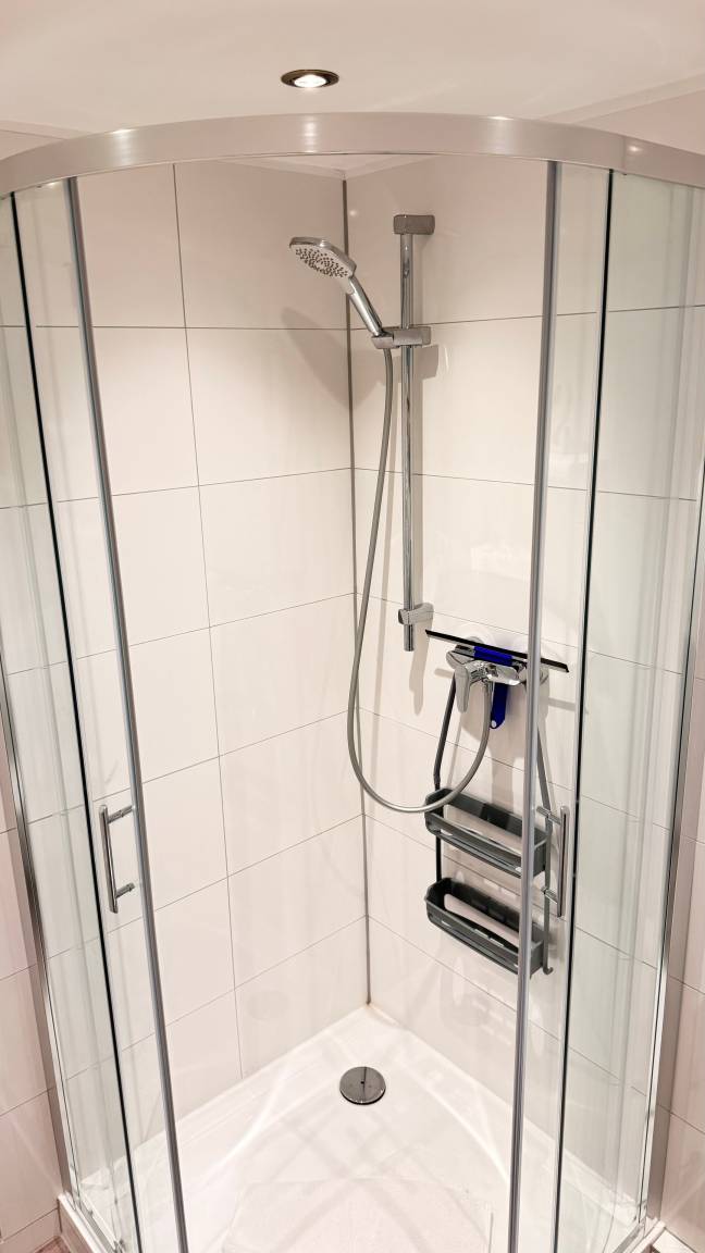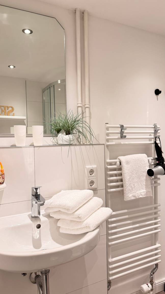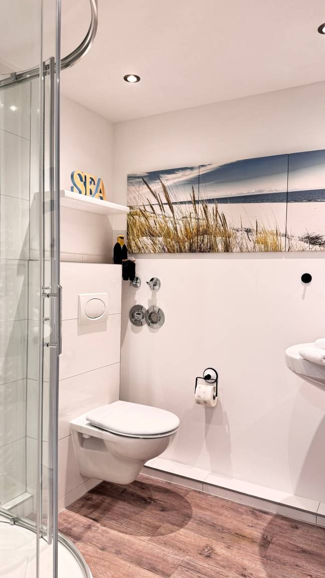 In dem komplett neu renoviertem Badezimmer befindet sich eine Dusche, Handtuchhalterung und kleine Ablagemöglichkeiten.