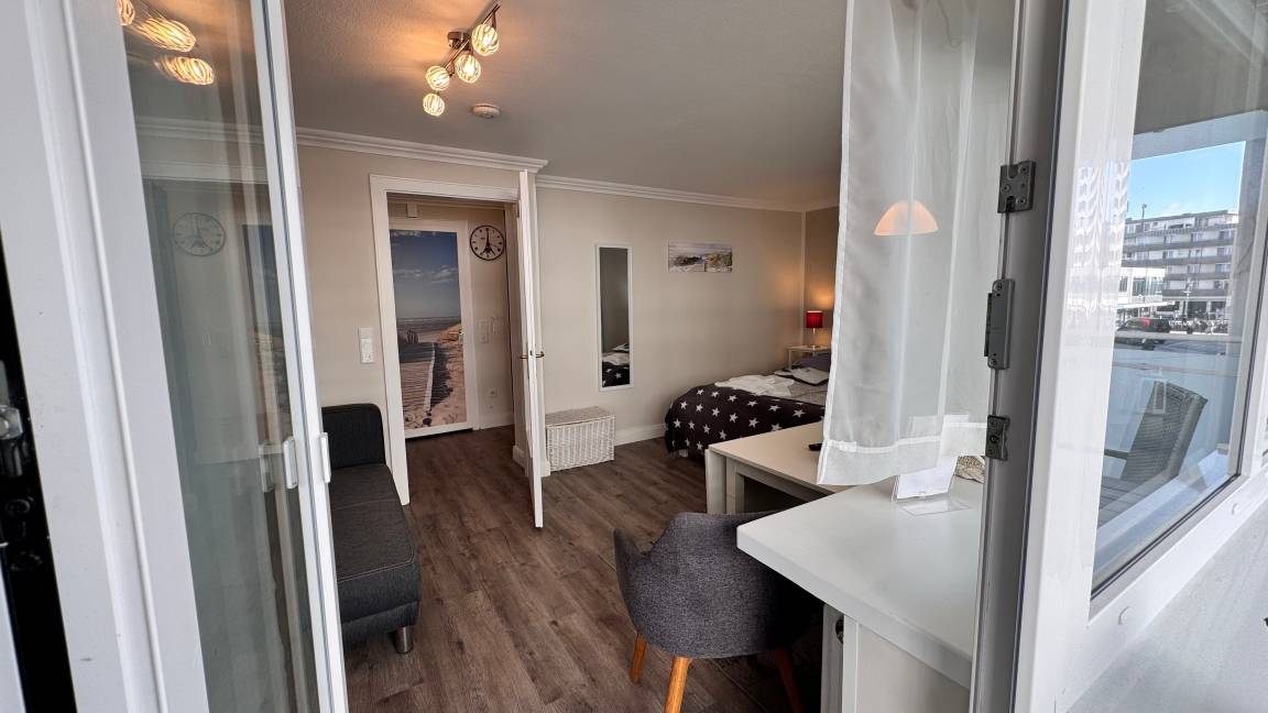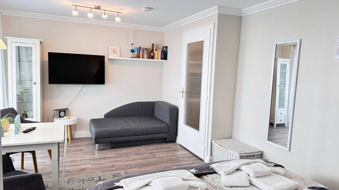 Der Wohn-und Schlafraum wurde 2024 teilrenoviert, gestrichen und es wurde ein Vinyl Fußboden verlegt. Es befindet sich hier ein gemütliches, weißes Bett ( 1,60 x 2 m) mit 2 Matratzen, weißer Schwebetüren-Kleiderschrank, großer Flachbild-TV, Internetzugang via WLAN (ohne Gewähr), Esstisch mit zwei gemütlichen Sesseln und Verdunklungs-Plissees.