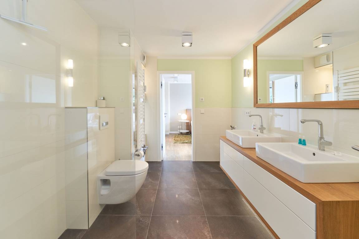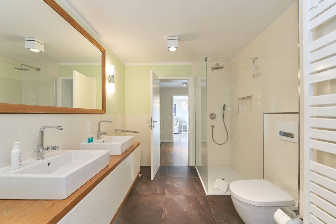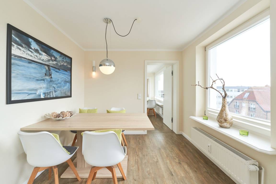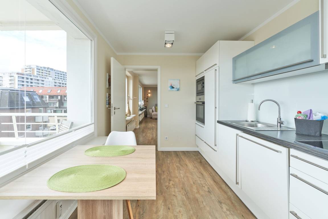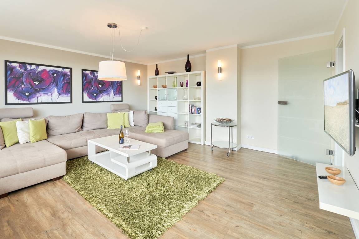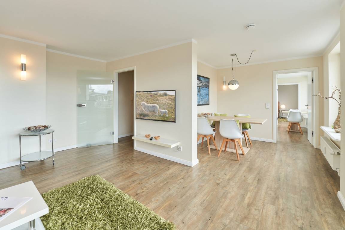 Das stilvolle Duschbad überzeugt mit hellen Fliesen, einem Doppelwaschtisch und Fußbodenheizung, während das großzügige Wohnzimmer mit separater Essecke ein einladendes Ambiente schafft. Die moderne, komplett ausgestattete Küche lässt keine Wünsche offen. Zudem steht Ihnen ein kostenloser Stellplatz in der Doppelgarage zur Verfügung. Genießen Sie Ihren Wohlfühlurlaub in unmittelbarer Strandnähe!