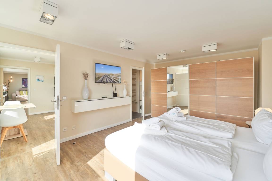 Diese großzügige Ferienwohnung in Westerland auf Sylt ist der perfekte Ort für einen erholsamen Urlaub. Mit einer Fläche von 80 qm und zwei westlich ausgerichteten Balkonen, die einen herrlichen Meerblick bieten, ist sie ideal für entspannte Stunden im Freien. Das Schlafzimmer mit Doppelbett und praktischem Schiebetürenschrank sorgt für Komfort und ausreichend Stauraum.