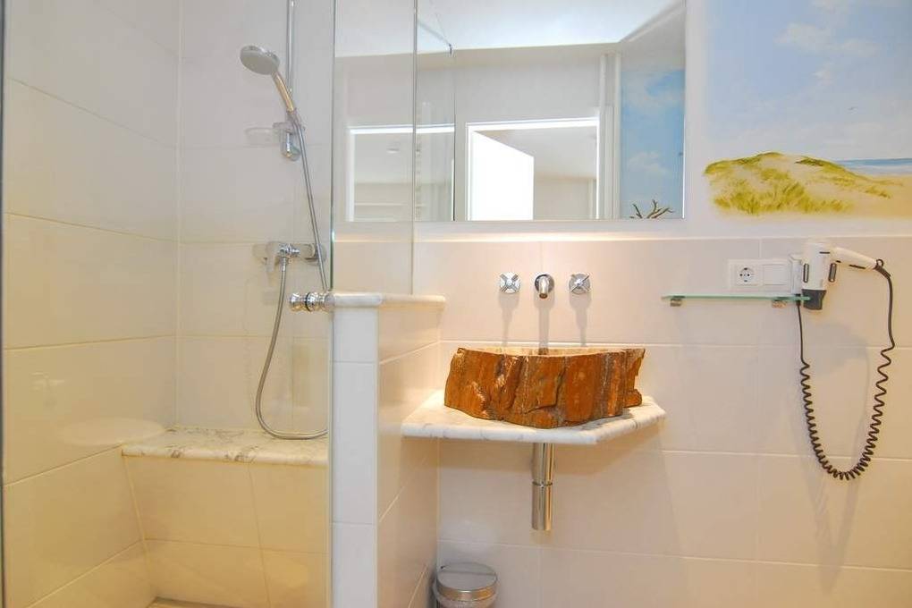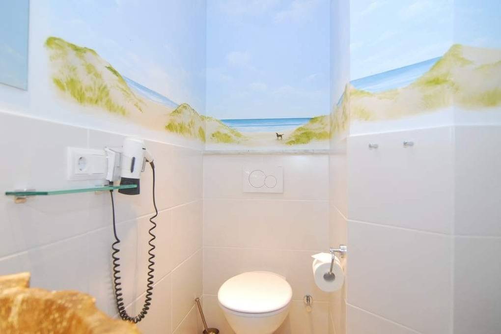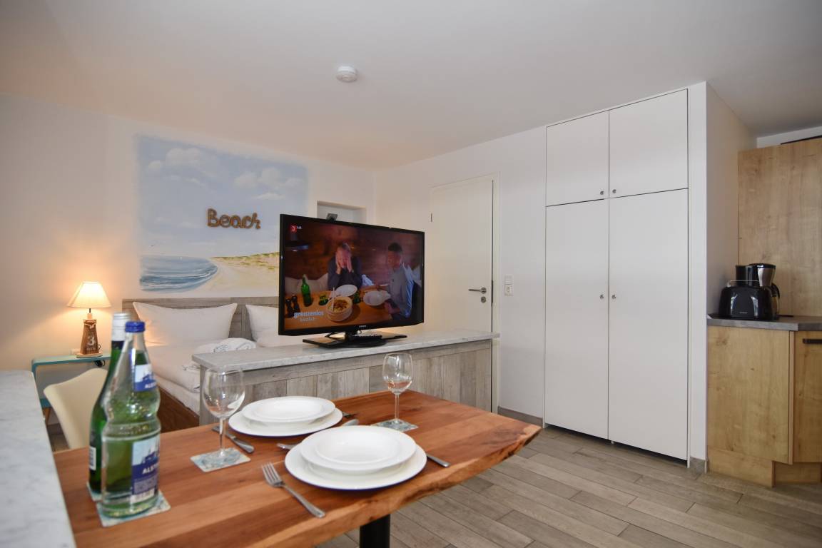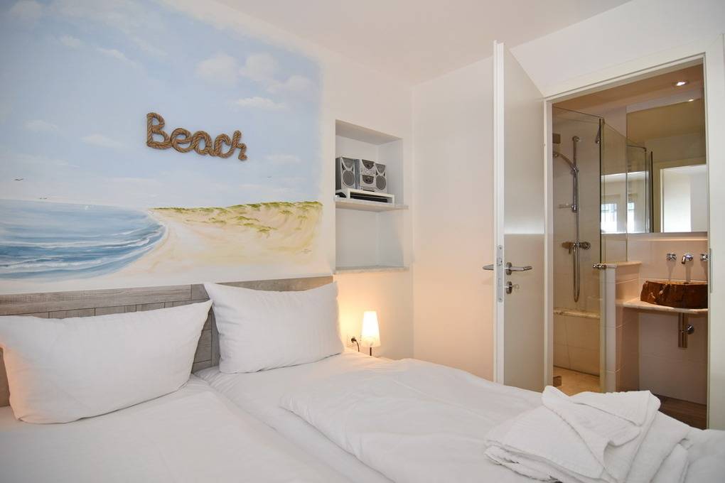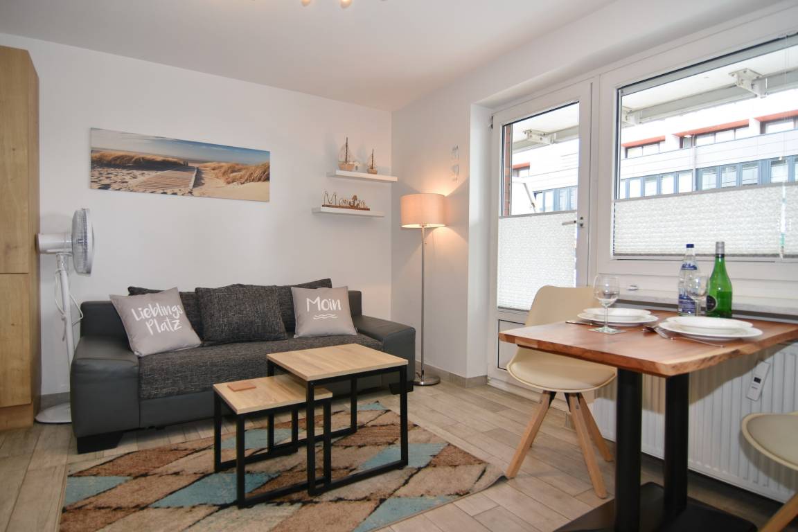 Die Wohnung "Meeresrauschen" macht Ihrem Namen alle Ehre. Sie wohnen in einer modernen 1-Zimmer-Wohnung im Zentrum Westerlands und können hier das Meer schon hören. Der kombinierte Wohn-/Schlafraum verfügt über ein festes Doppelbett (2x80x200), eine gemütliche Sitzecke und einen Essplatz am Fenster und ist mit einer Aussenjalousie vollständig verdunkelbar. Der große Flachbild-TV lässt sich drehen, so dass man sowohl von der Sitzecke als auch vom Bett aus TV schauen kann. Vom Wohnraum gelangen Sie auf den großzügigen Westbalkon. Die kleine, offene Einbauküche hat neben einem Ceranherd, einen Backofen und Geschirrspüler. Das Duschbad/WC ist aufwendig gestaltet und die Dusche bietet sogar einen Sitzplatz. W-LAN ist vorhanden (ohne Gewähr). Rauchverbot. Waschküche mit Münz-Waschmaschine und -Trockner. Bettwäsche und Handtücher sind zur Anreise aufgezogen. Ein PKW-Stellplatz kann kostenpflichtig zugebucht werden. Fahrstuhlerneuerung vom 03.11.-19.12.2025 - Baulärm kann vorhanden sein.