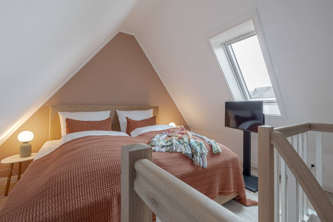 Über eine Treppe gelangen Sie in das ruhige Schlafzimmer mit hochwertigem Schramm Boxspringbett, das Ihnen erholsame Nächte nach langen Strandspaziergängen schenkt. Als Gast steht Ihnen der 200 Quadratmeter große Pool und Saunabereich in Dock 6d kostenfrei zur Verfügung. Ein 12 mal 4 Meter Pool, eine moderne Sauna, ein Loungebereich sowie Fitnessgeräte sorgen für Entspannung und Bewegung ganz nach Ihrem Geschmack. Hunde sind bei uns herzlich willkommen. Ein kostenfreier Parkplatz gehört selbstverständlich ebenfalls zu Ihrer Kajüte.
