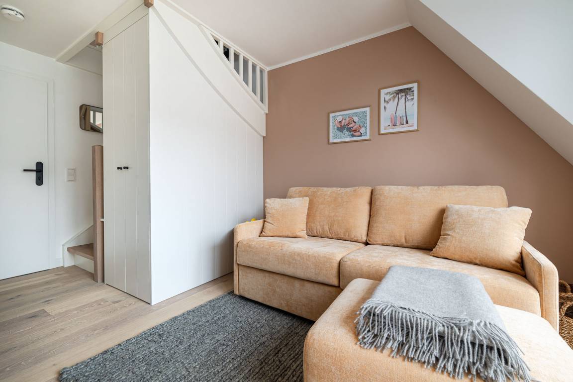 Schon beim Eintreten spürt man die besondere Atmosphäre. Lichtdurchflutete Räume, warmes Eichenparkett und ein fein abgestimmtes Interieur schaffen eine Balance aus nordischer Klarheit und gemütlicher Geborgenheit. Genau der richtige Ort, um zur Ruhe zu kommen und sich ganz auf die Insel einzulassen.Auf dem Mitteldeck befinden sich der Wohn und Essbereich mit voll ausgestatteter Küche sowie das moderne Bad. Im Wohnbereich lädt ein hochwertiges Sofa zum Entspannen ein und lässt sich bei Bedarf in eine zusätzliche Schlafmöglichkeit verwandeln. Die Küche ist mit Markengeräten unter anderem von Siemens ausgestattet und bietet alles, was Sie für ein entspanntes Frühstück oder ein gemeinsames Abendessen benötigen.