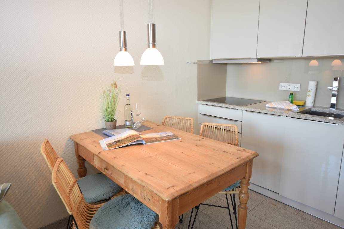 Die moderne Pantryküche ist voll ausgestattet mit einem Geschirrspüler, einem Cerankochfeld sowie einem Kühlschrank mit 3-Sterne-Gefrierfach. Zur Grundausstattung gehören zudem eine Nespresso- und Filterkaffeemaschine, ein Wasserkocher und ein Toaster.