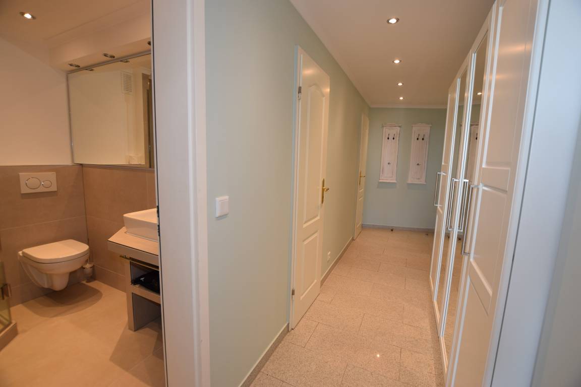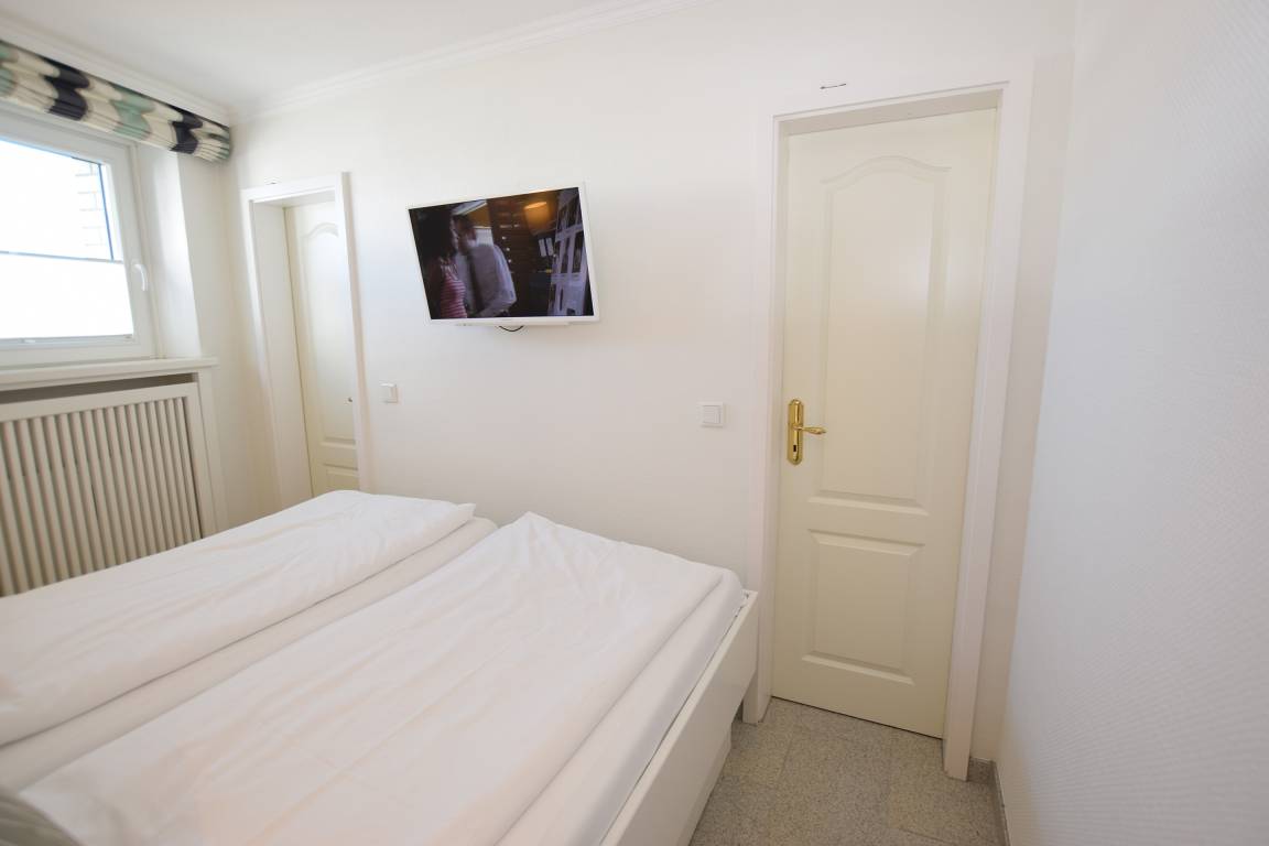 Im Schlafzimmer erwartet Sie ein komfortables Doppelbett mit maßgeschneiderten Tischlereinbauten (1,80 x 2,00m, bestehend aus zwei hochwertigen Einzelmatratzen) in Komfortliegehöhe (ca. 60 cm). Auch hier steht Ihnen ein Fernseher zur Verfügung. Beide Bettseiten sind gut erreichbar.
