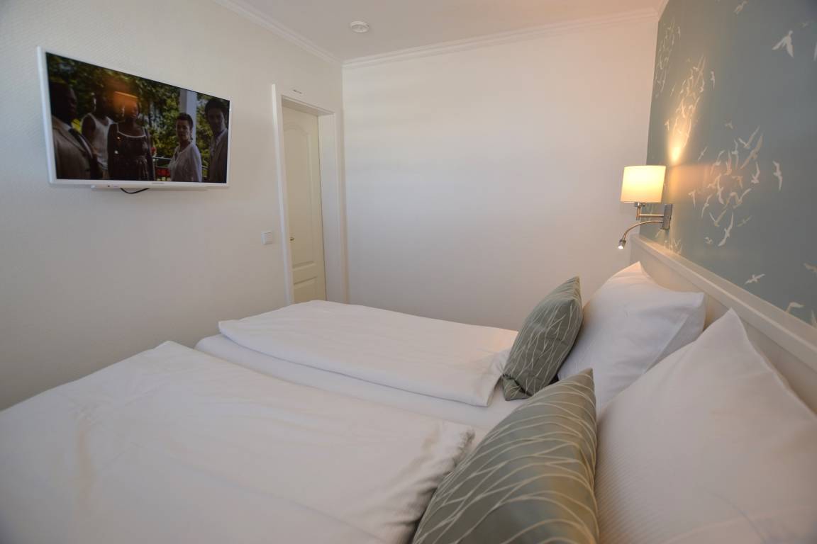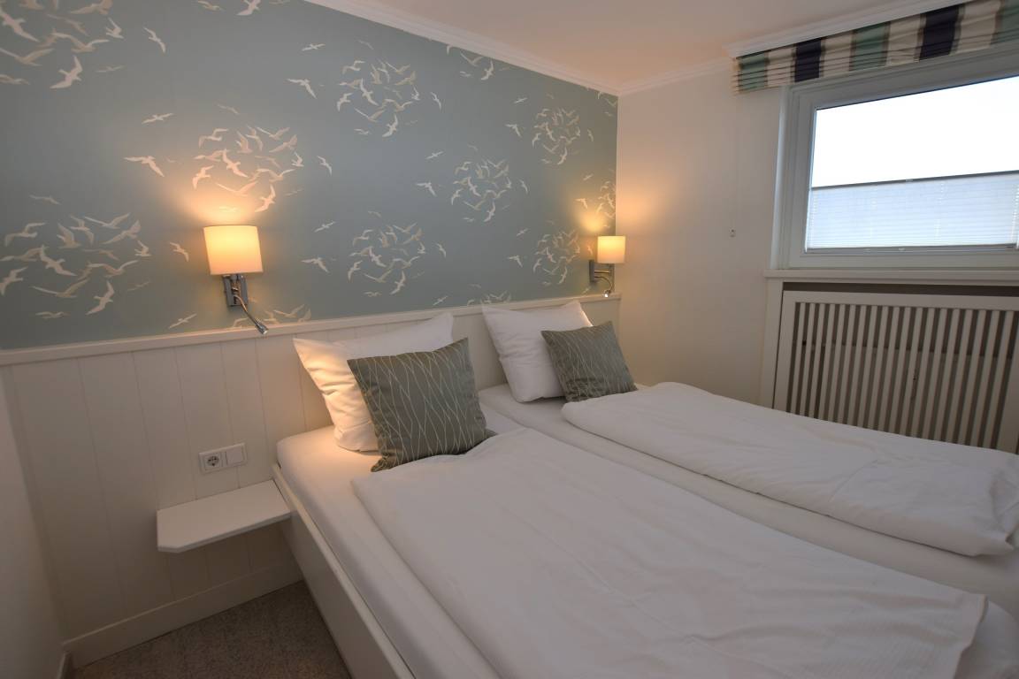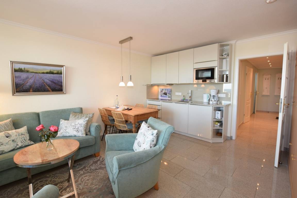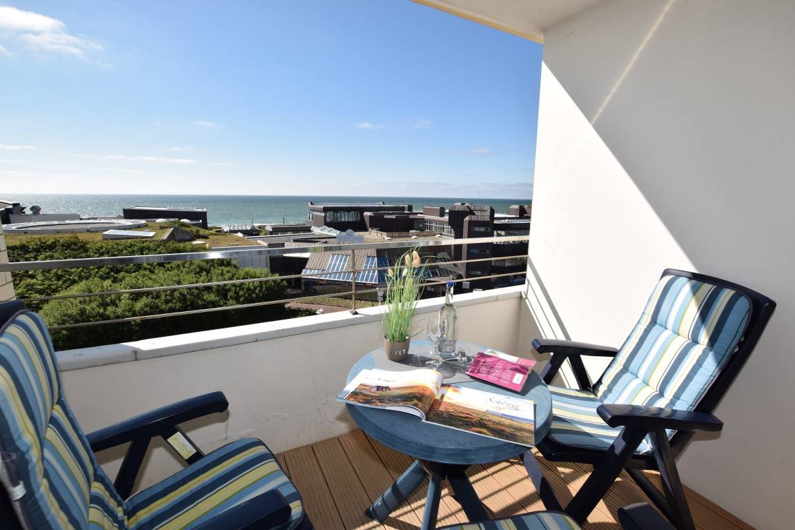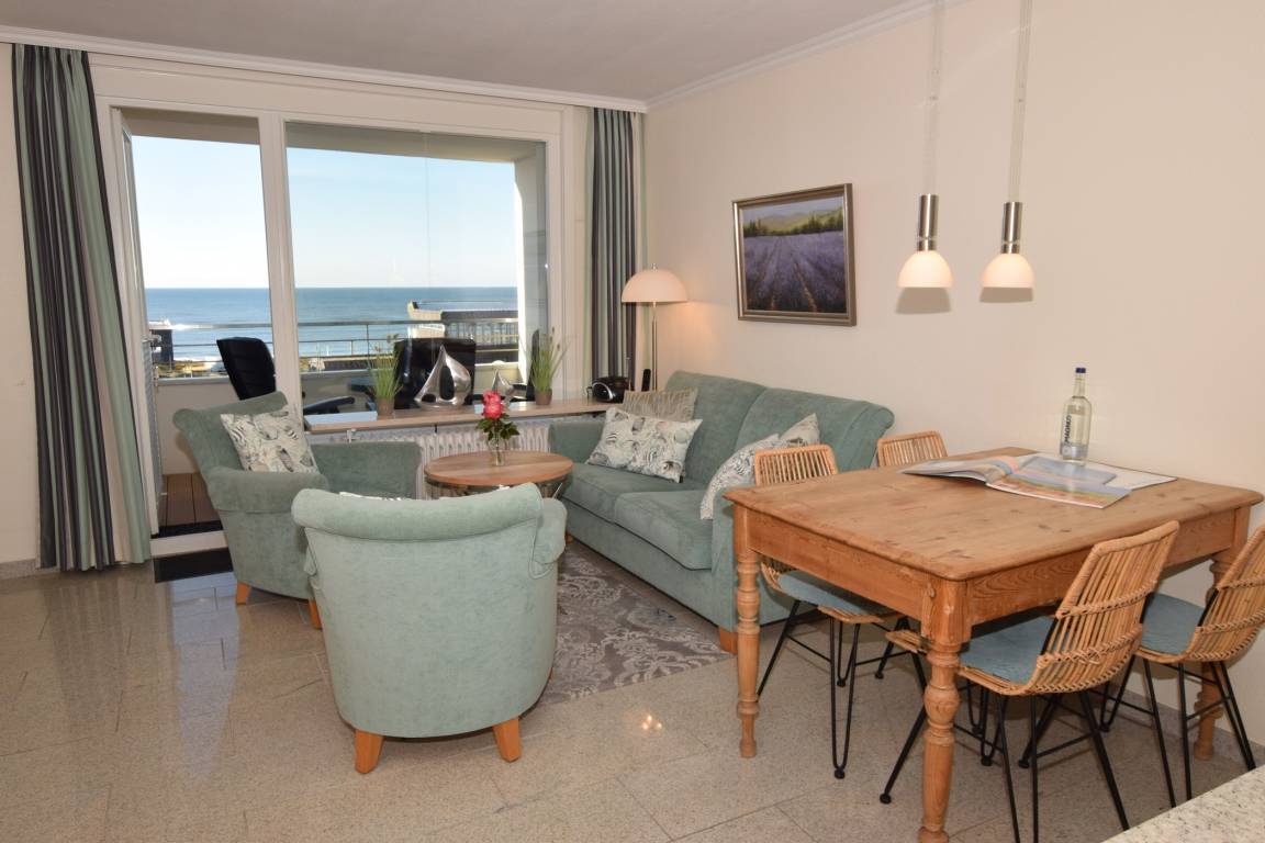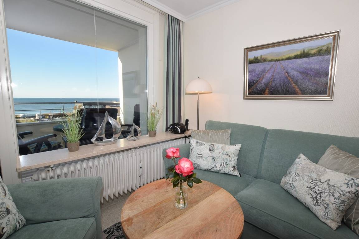 2-Zimmer-Nichtraucher-Ferienwohnung (ca. 46 qm) in der 5. Etage zur Seeseite mit herrlichem Meerblick für max. 3 Personen mit Westloggia (Nachmittagssonne, mit Balkonmöbeln und Auflagen).